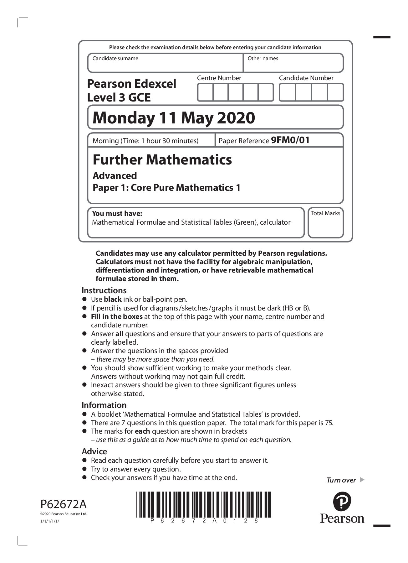 Mathematics > Edexcel Question Paper > Pearson Edexcel_Further Mathematics_9FM0/01 Question Paper_2020 | Paper 1: Core Pure Mathematics 1 (All)