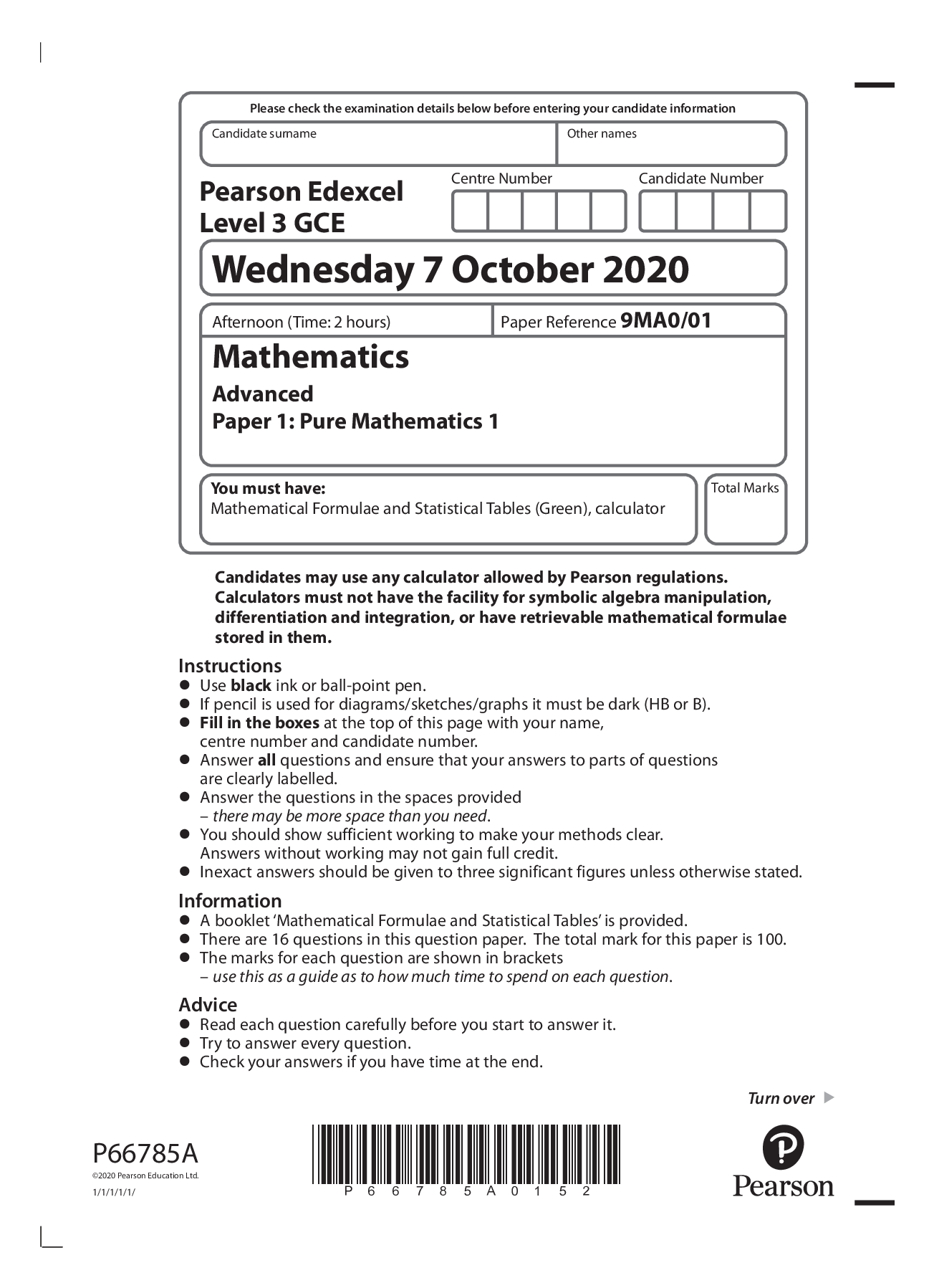 Mathematics > Edexcel > Further Mathematics_9MA0/01 Question Paper_2020 | Pure Mathematics 1 (All)