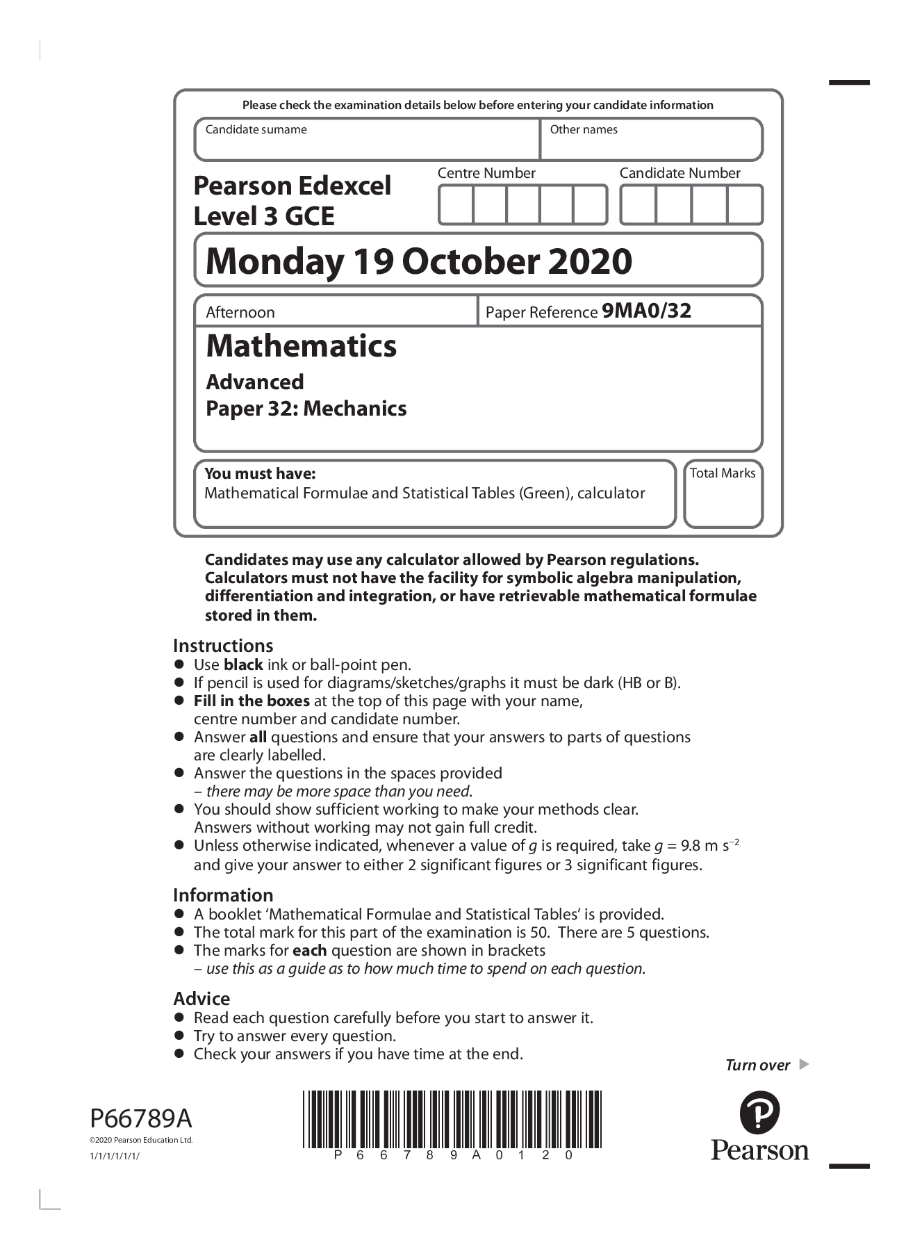 Mathematics > Edexcel > Pearson Edexcel_Further Mathematics_9MA0/32 Question Paper_2020 | Paper 32: Mechanics (All)