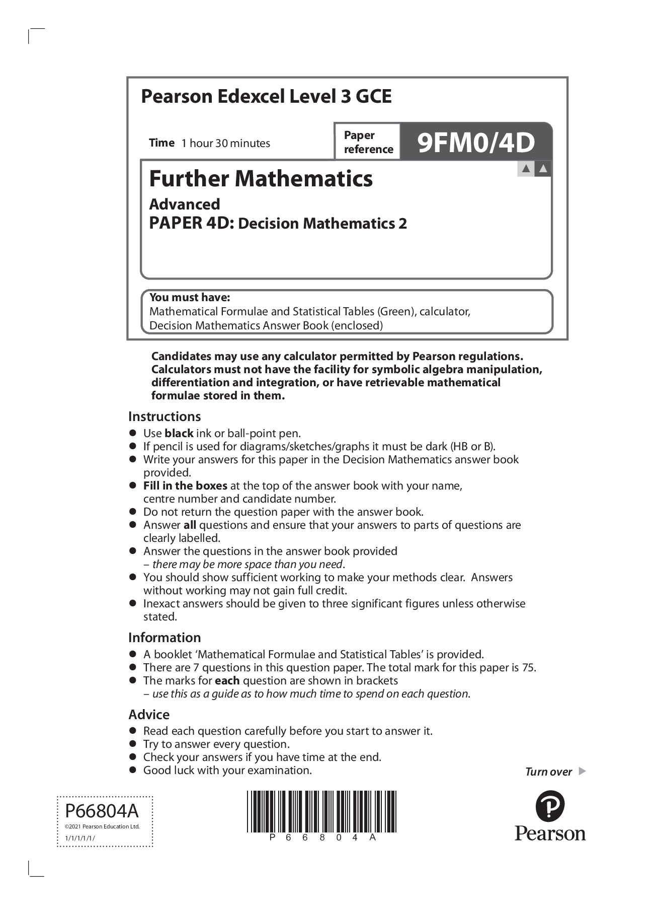 Mathematics > Edexcel > Pearson Edexcel GCE Question Booklet + Mark Scheme (Results) November 2021 Further Mathematics Advanced Level in Further Mathematics Decision 2 Paper 9FM0/4D (All)