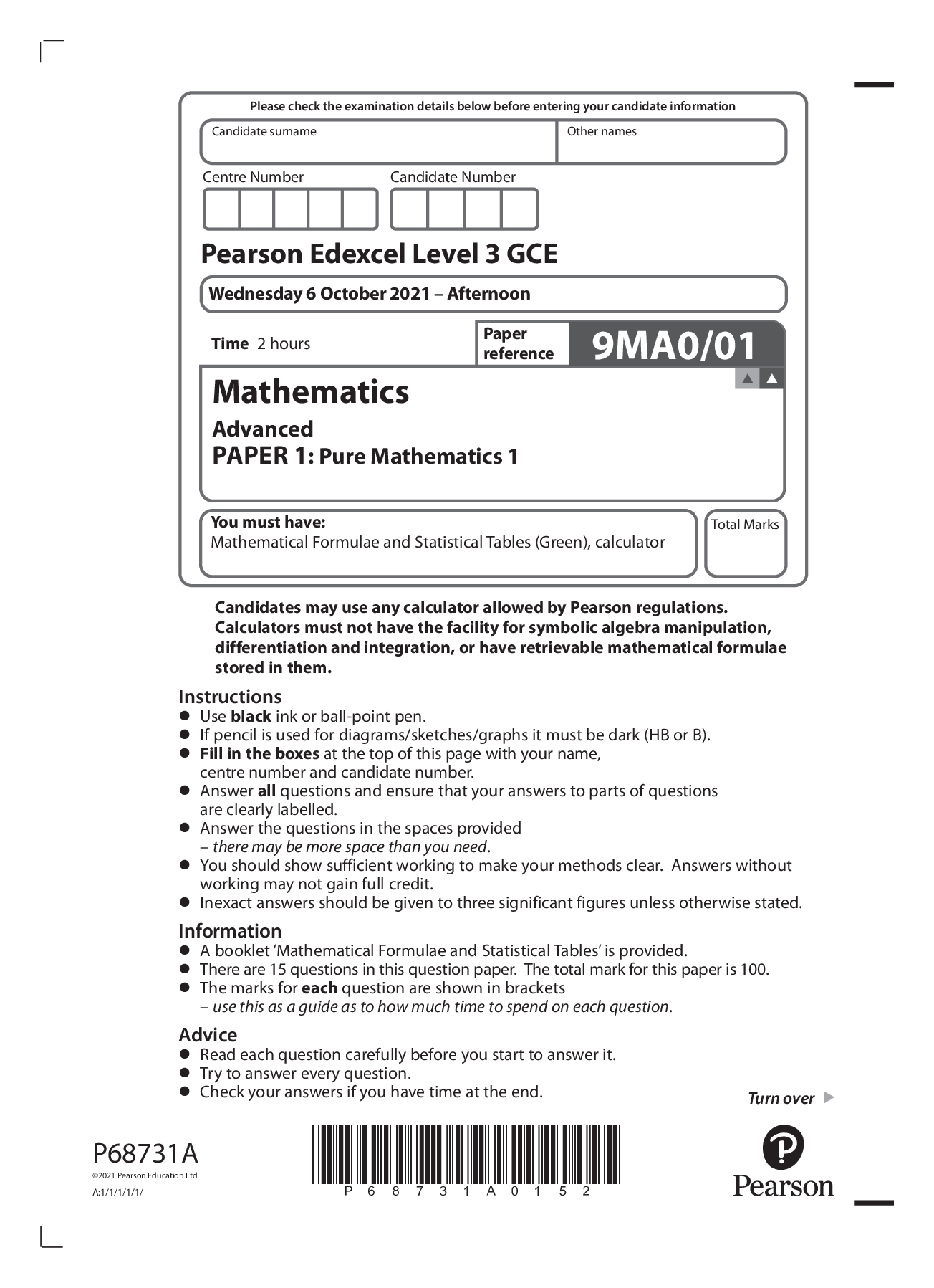 Mathematics > Edexcel > Pearson Edexcel GCE Question Booklet + Mark Scheme (Results) November 2021 Mathematics Pure 1 Paper 9MA0/01 (All)