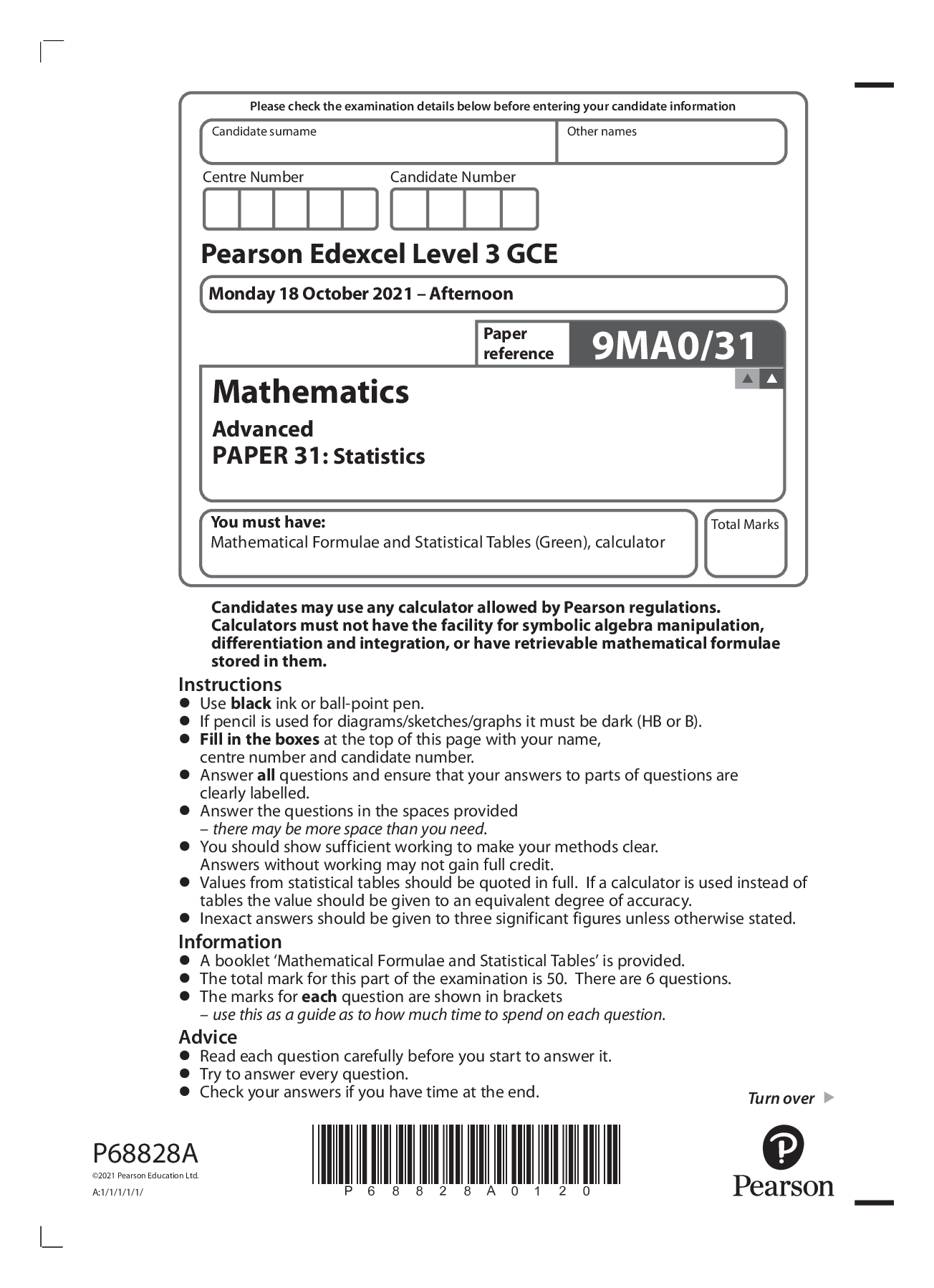 Mathematics > Edexcel > Pearson Edexcel GCE Question Booklet + Mark Scheme (Results) November 2021 In Mathematics (9MA0) Paper 31 Statistics (All)