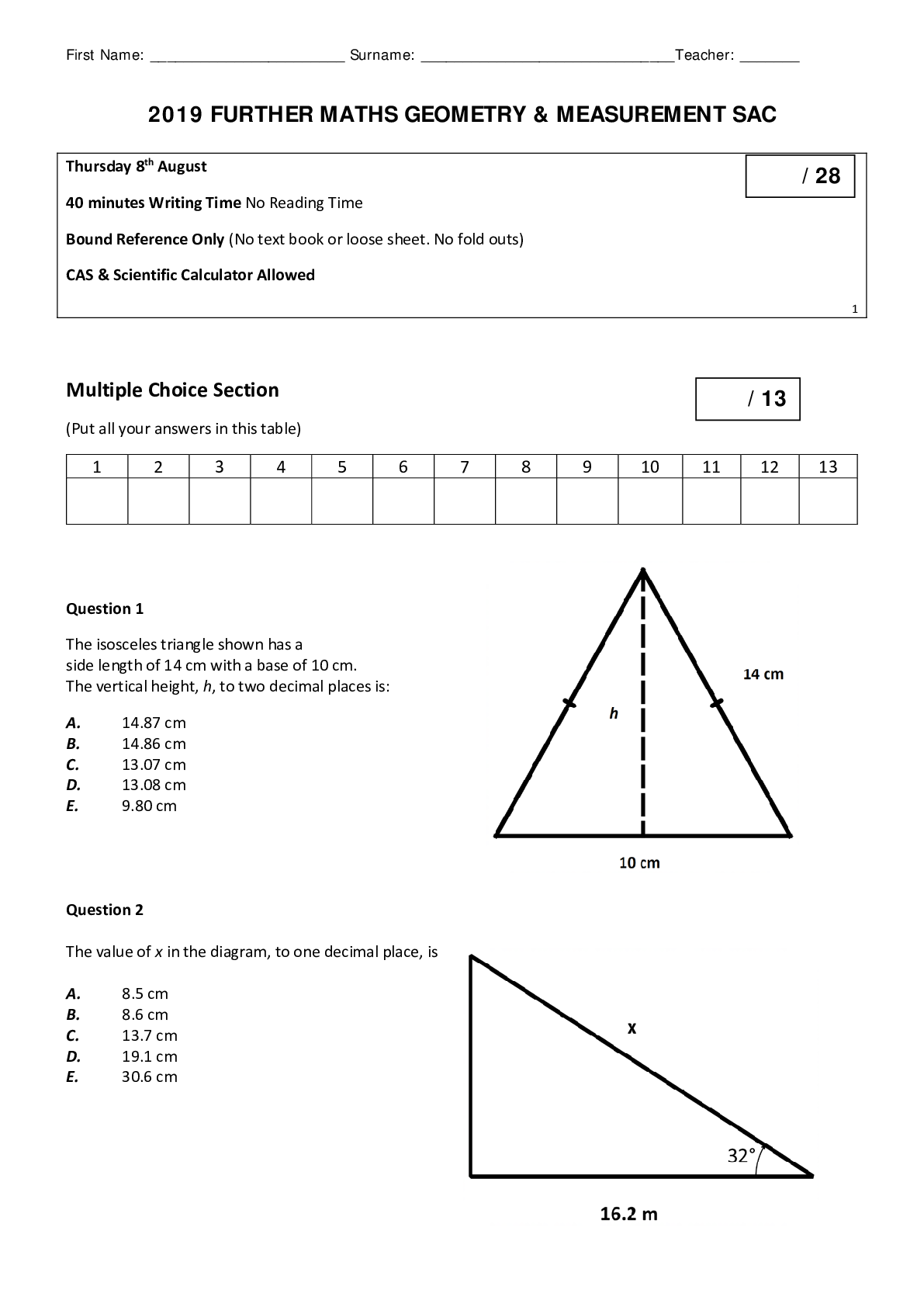 Mathematics > QUESTIONS & ANSWERS > Questions and Answers > MATH 123: 2019 FURTHER MATHS GEOMETRY & MEASUREMENT SAC (All)