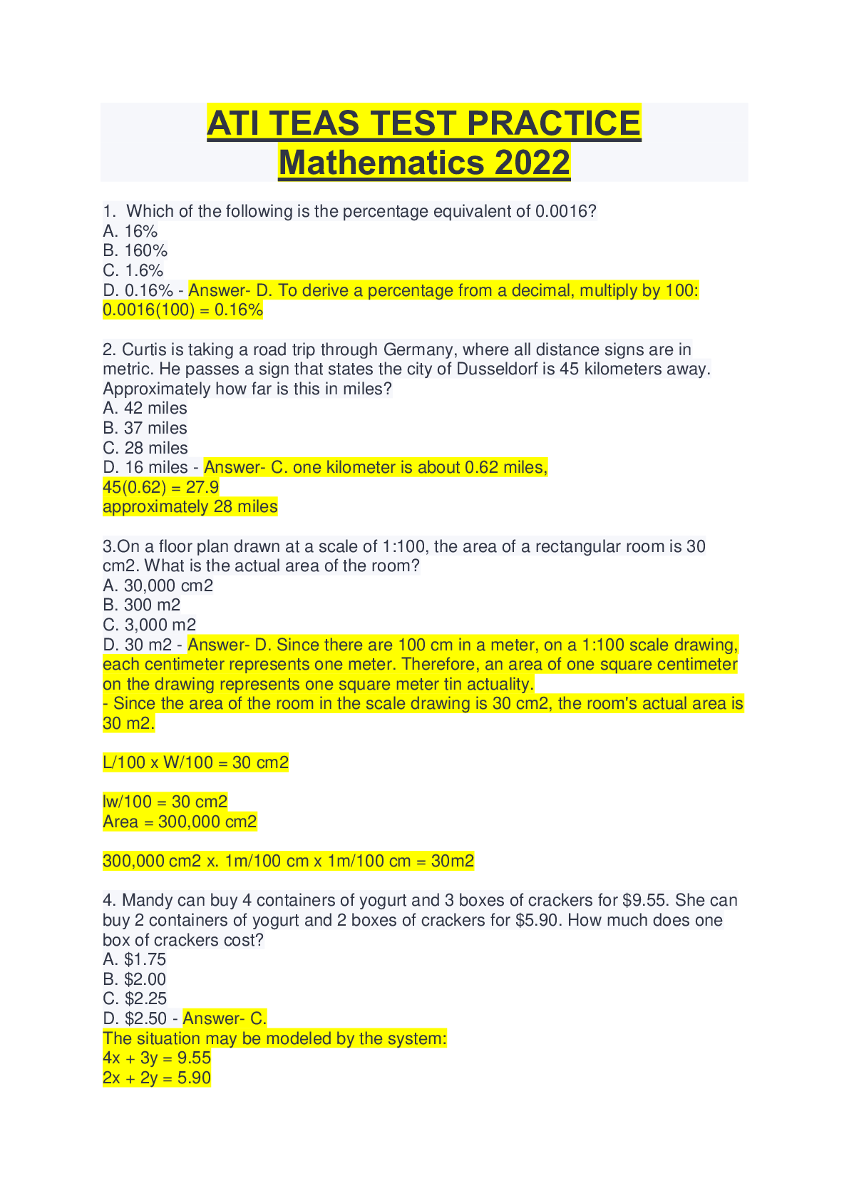 Mathematics > EXAM > ATI TEAS TEST PRACTICE Mathematics 2022 (All)