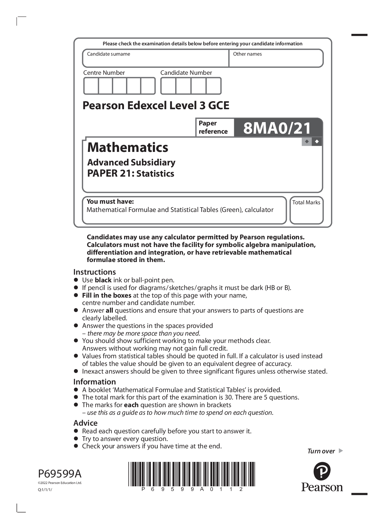Mathematics > A-Level Question Paper > EDEXCEL AS LEVEL MATHS 2022 PAPER 21 (All)