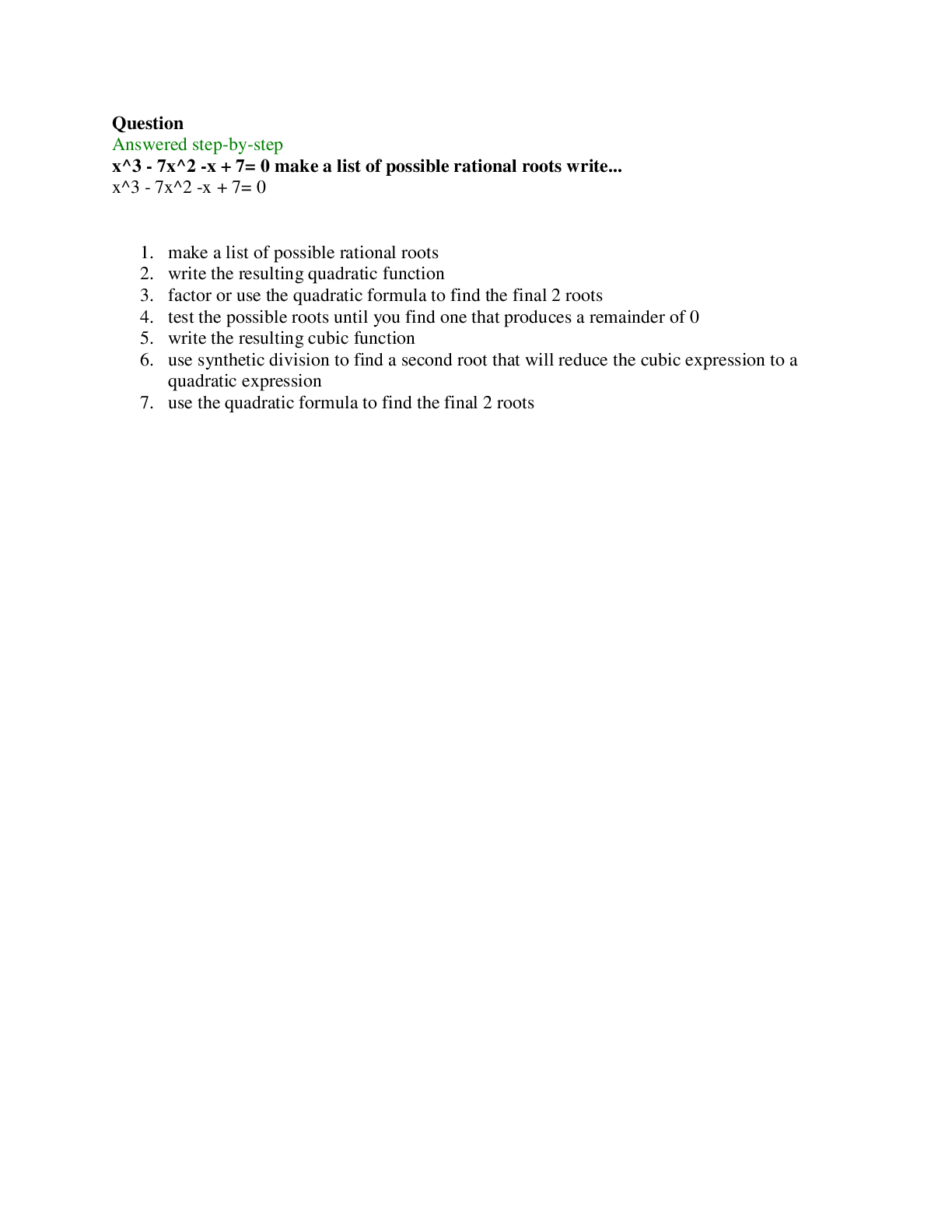Mathematics > QUESTIONS & ANSWERS > x^3 - 7x^2 -x + 7= 0 make a list of possible rational roots write( QUESTIONS & ANSWERS) (All)