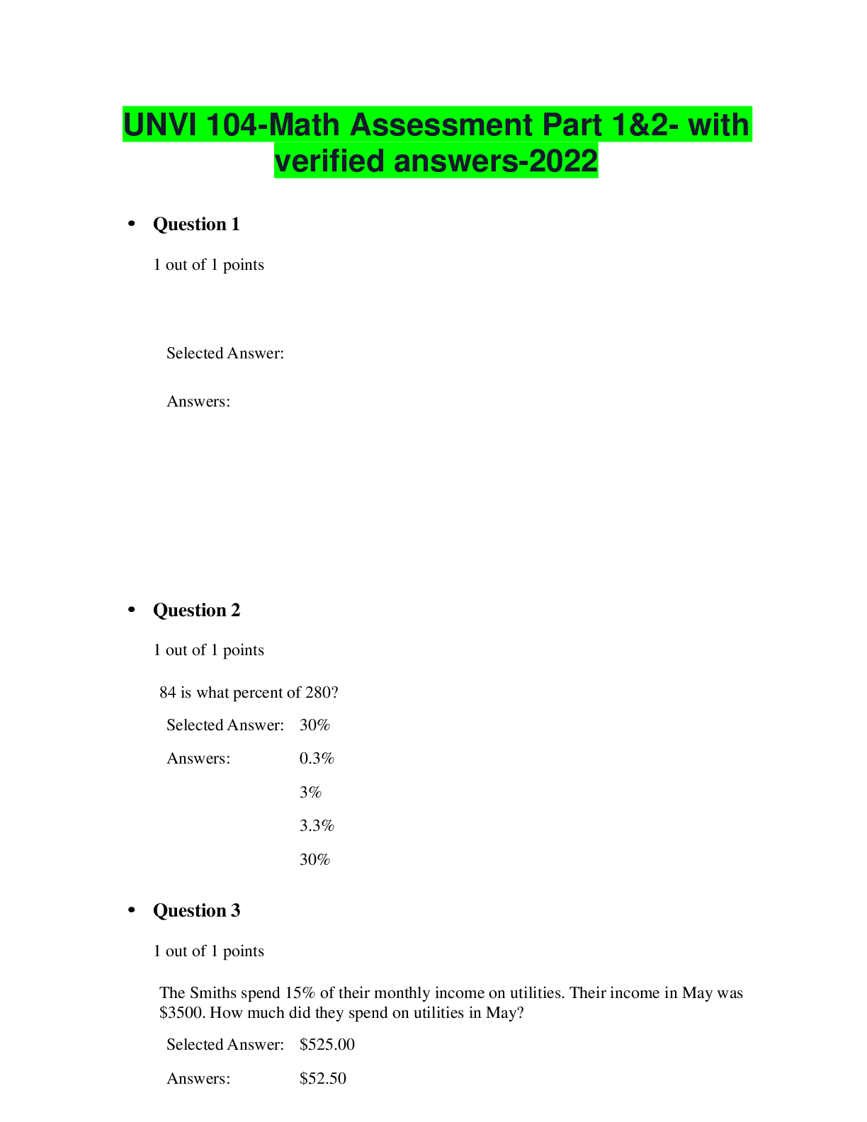 Mathematics > EXAM > UNVI 104-Math Assessment Part 1&2- with verified answers-2022 (All)