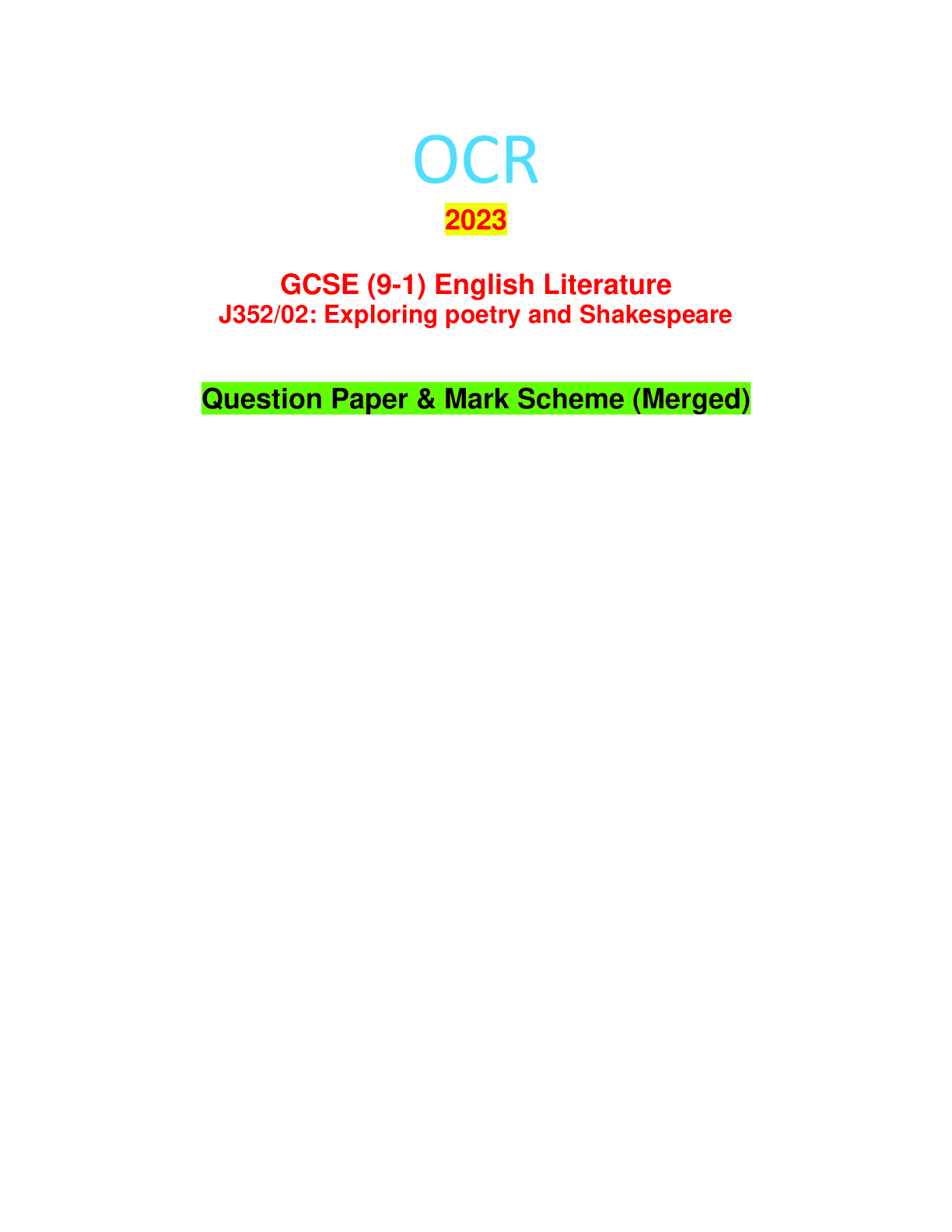 OCR > EXAM > 2023 GCSE (9-1) English Literature J352/02: Exploring poetry and Shakespeare Question Paper & Mark Scheme (Merged) (All)