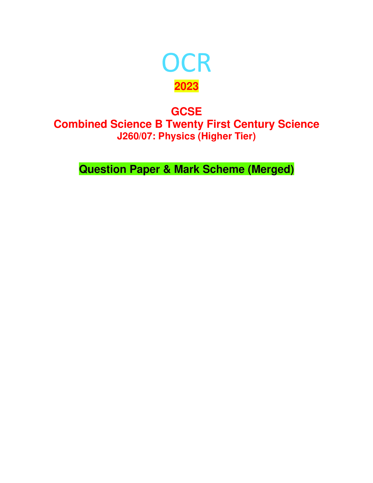 OCR > EXAM > 2023 GCSE Combined Science B Twenty First Century Science J260/07: Physics (Higher Tier) Question Paper & Mark Scheme (Merged) (All)