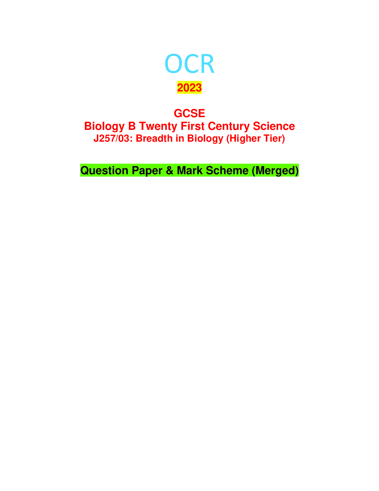 OCR > EXAM > 2023 GCSE Biology B Twenty First Century Science J257/03: Breadth in Biology (Higher Tier) Question Paper & Mark Scheme (Merged) (All)
