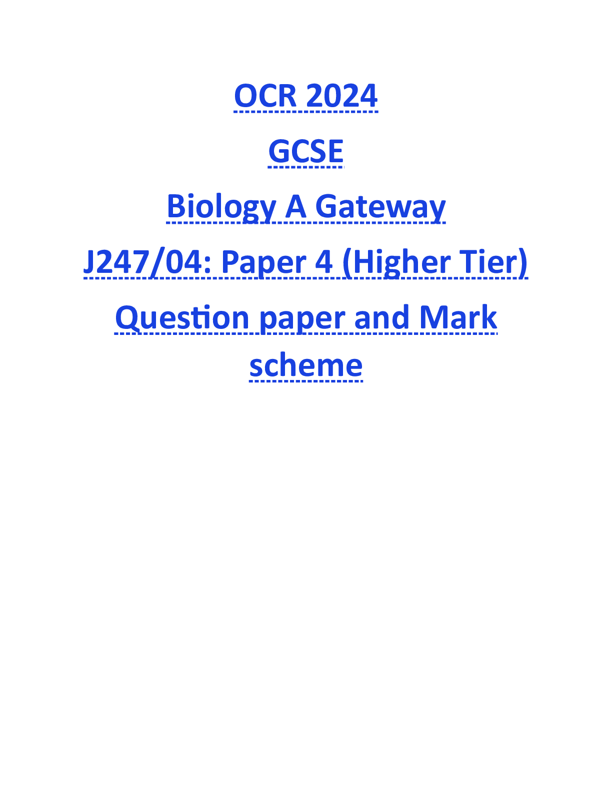 OCR > GCSE QUESTION PAPER > OCR 2024 GCSE Biology A Gateway J247/04: Paper 4 (Higher Tier) Question paper and Mark scheme (All)