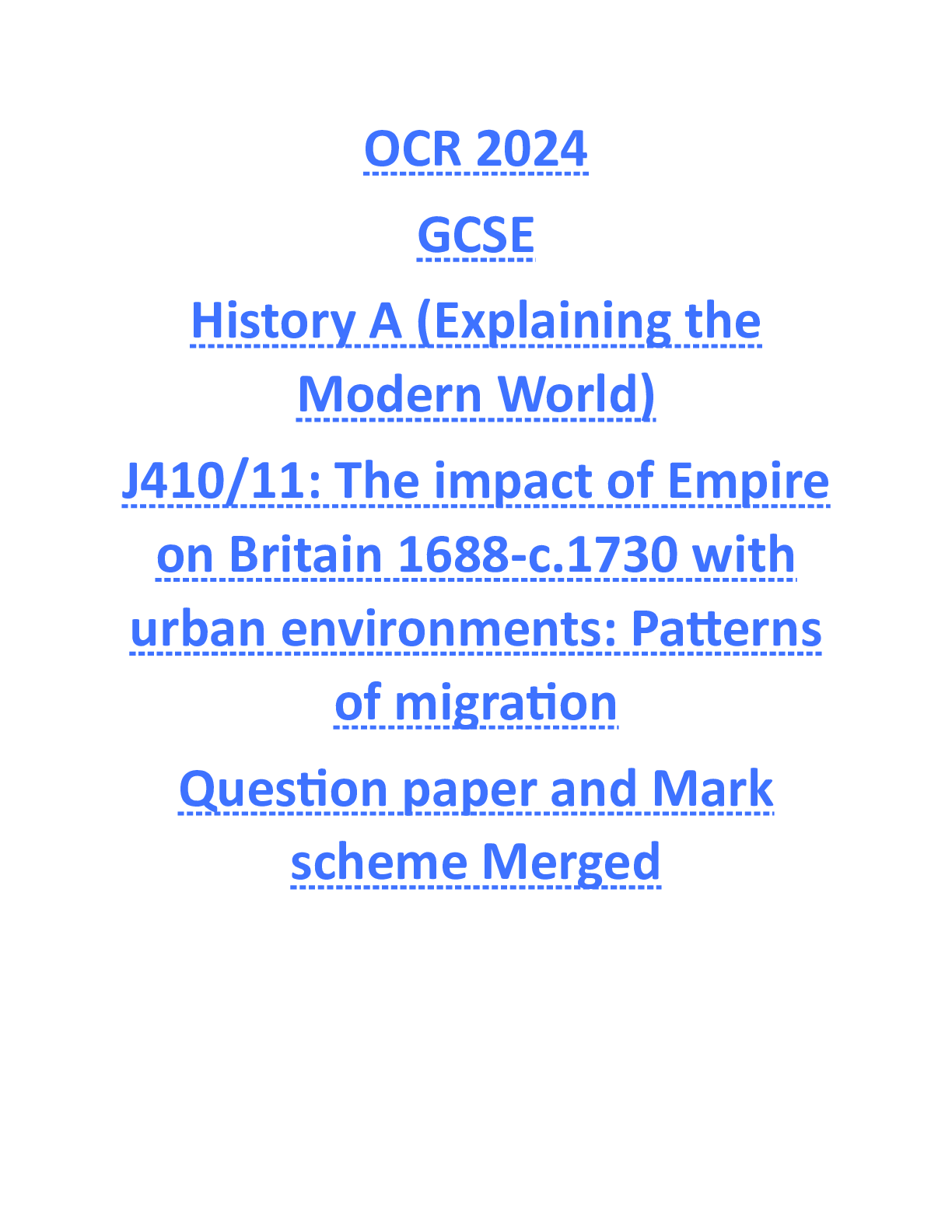 OCR > GCSE QUESTION PAPER > OCR 2024 GCSE History A (Explaining the Modern World) J410/11: The impact of Empire on Britain 1688-c.1730 with urban environments: Patterns of migration Question paper and Mark scheme Merged (All)