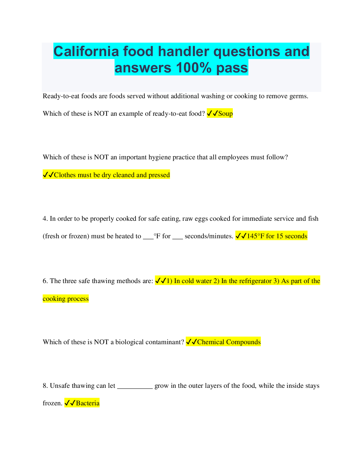 ServSafe > QUESTIONS & ANSWERS > California food handler questions and answers 100% pass (All)