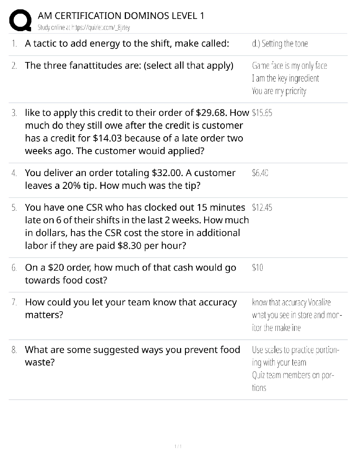 ServSafe Food Safety Training Program (SERVSAFE) > QUESTIONS & ANSWERS > AM Certification Dominos Level 1 / Assistant Manager Training / 2025 Update / Score 100% (All)