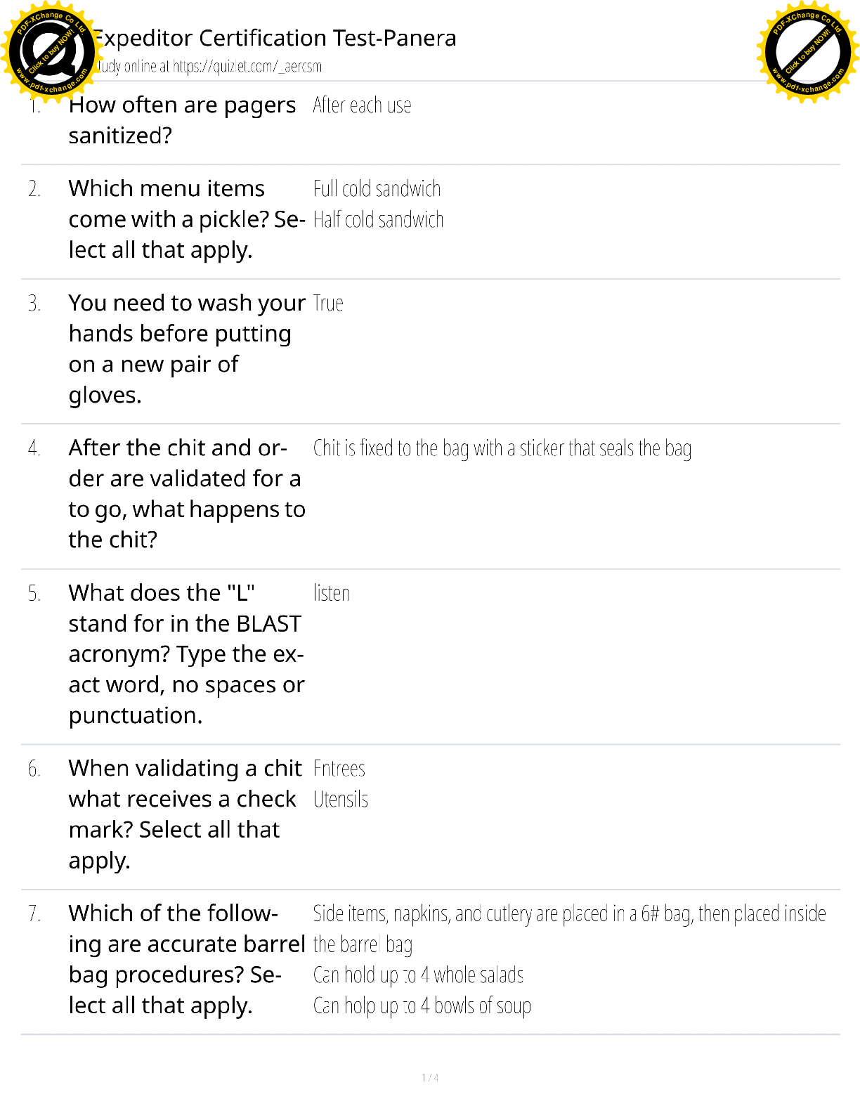 ServSafe Food Safety Training Program (SERVSAFE) > QUESTIONS & ANSWERS > Expeditor Certification Test - Panera / Practice Exam & Study Guide / 2025 Update / Score 100% (All)