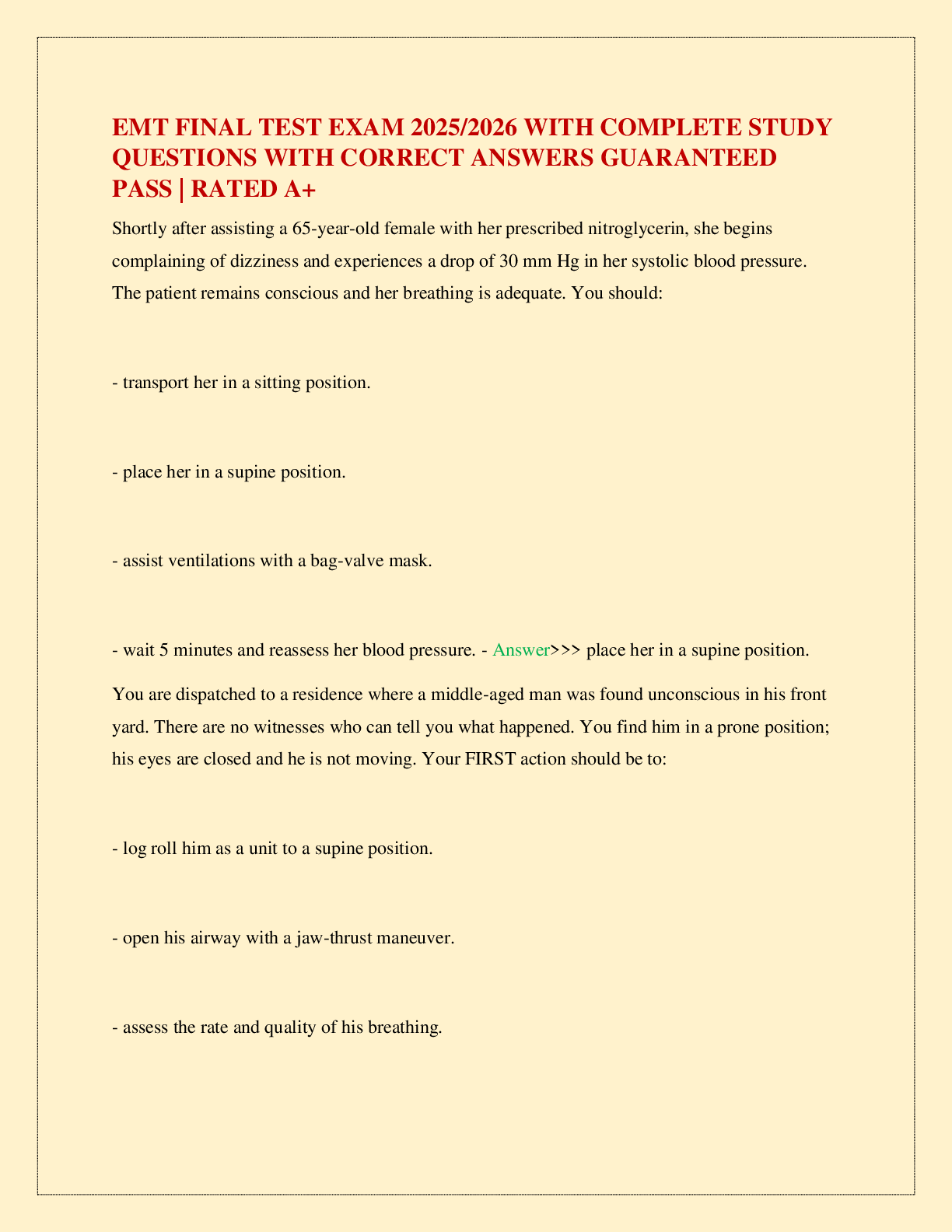 EMT-B - Emergency Medical Technician - Basic > EXAM > EMT FINAL TEST EXAM 2025/2026 WITH COMPLETE STUDY QUESTIONS WITH CORRECT ANSWERS GUARANTEED PASS | RATED A+ (All)