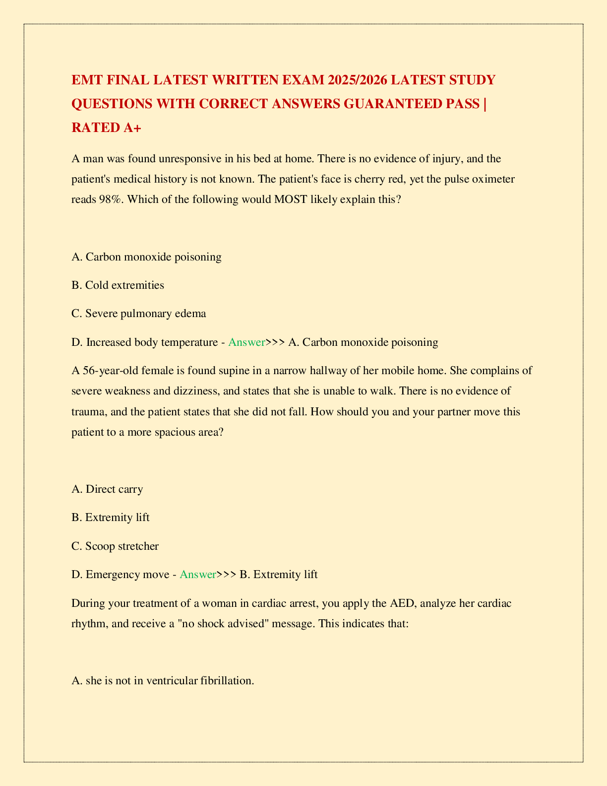 EMT-B - Emergency Medical Technician - Basic > EXAM > EMT FINAL LATEST WRITTEN EXAM 2025/2026 LATEST STUDY QUESTIONS WITH CORRECT ANSWERS GUARANTEED PASS | RATED A+ (All)