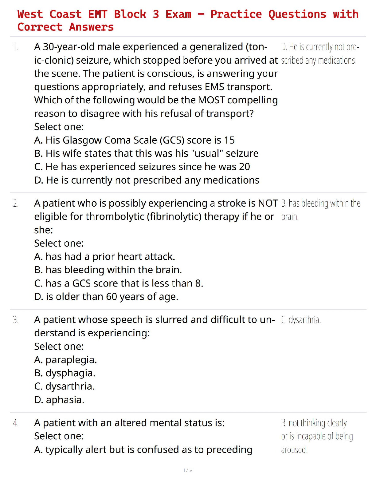 EMT-B - Emergency Medical Technician - Basic > QUESTIONS and ANSWERS > West Coast EMT Block 4 Exam – Practice Questions with Correct Answers (All)
