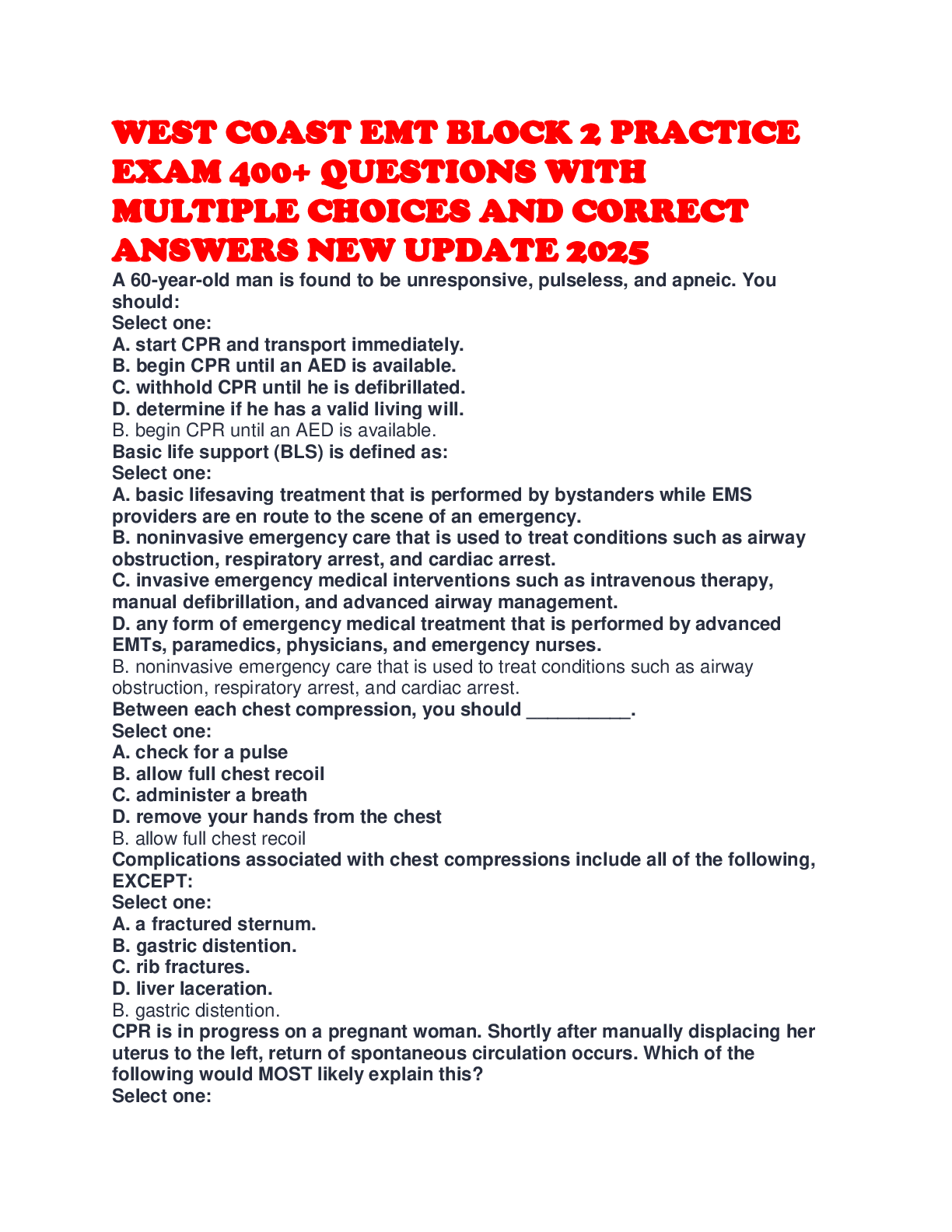 EMT-B - Emergency Medical Technician - Basic > EXAM > WEST COAST EMT BLOCK 2 PRACTICE EXAM 400+ QUESTIONS WITH MULTIPLE CHOICES AND CORRECT ANSWERS NEW UPDATE 2025 (All)