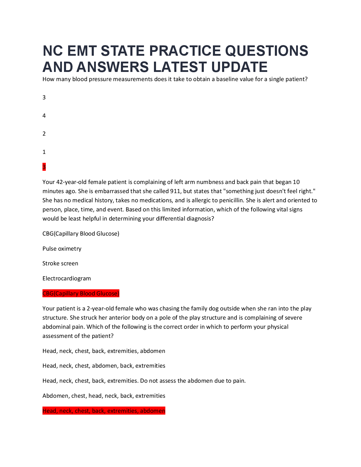 EMT-B - Emergency Medical Technician - Basic > EXAM PROCTORED > NC EMT STATE PRACTICE QUESTIONS AND ANSWERS LATEST UPDATE (All)