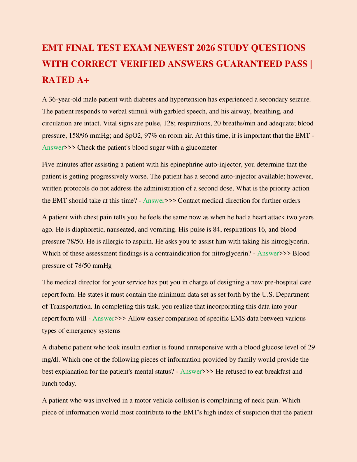 EMT-B - Emergency Medical Technician - Basic > EXAM > EMT FINAL TEST EXAM NEWEST 2026 STUDY QUESTIONS WITH CORRECT VERIFIED ANSWERS GUARANTEED PASS | RATED A+ (All)