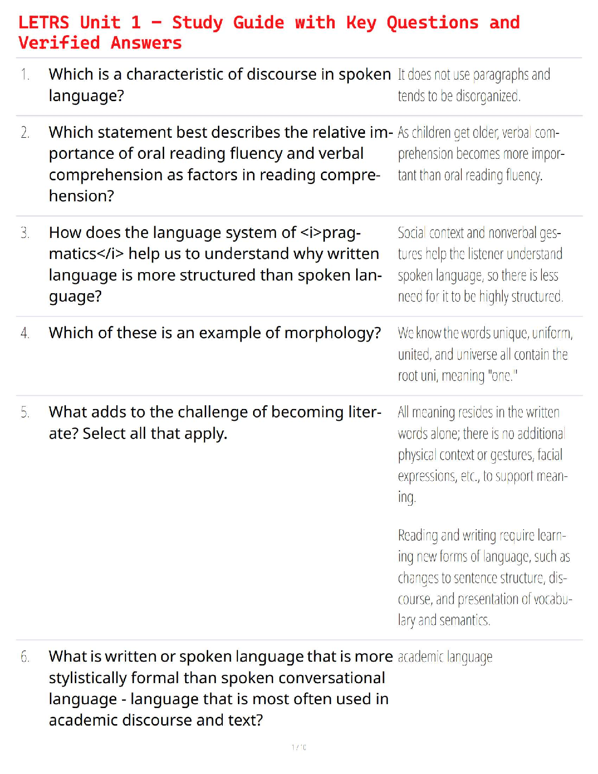 LETRS > QUESTIONS and ANSWERS > LETRS Unit 1 – Study Guide with Key Questions and Verified Answers (All)