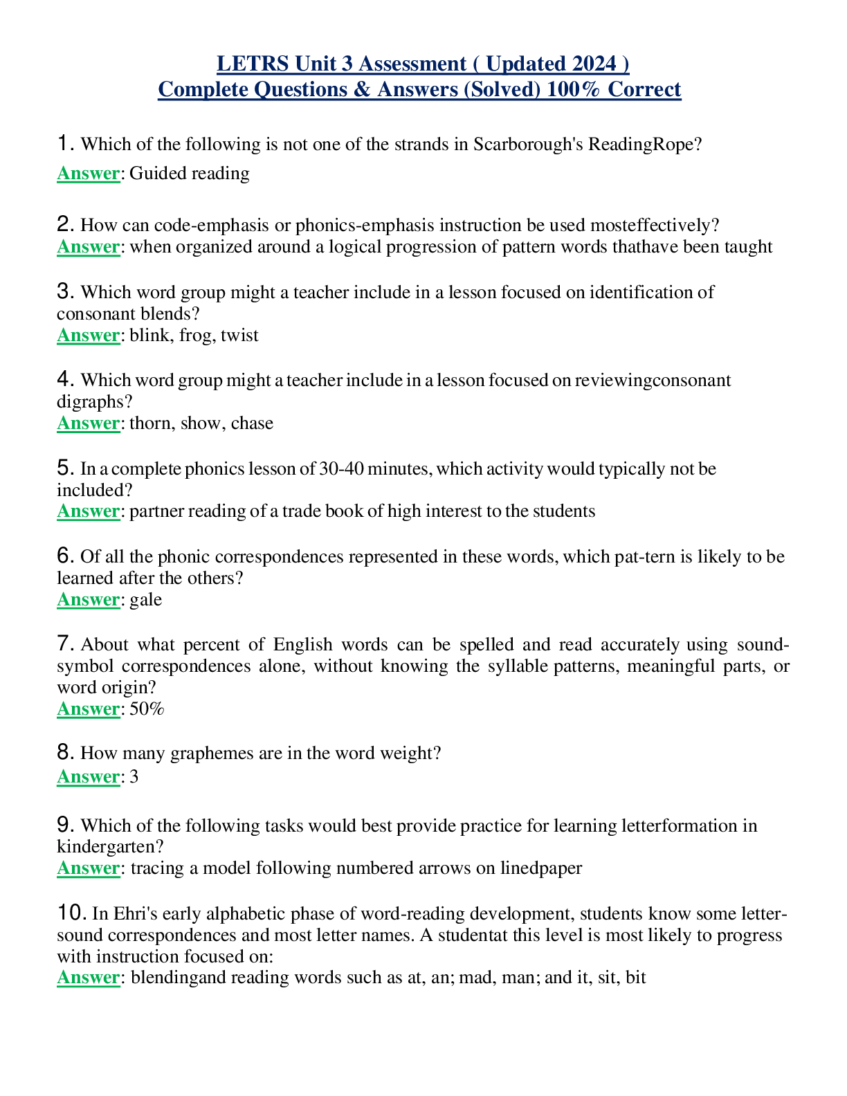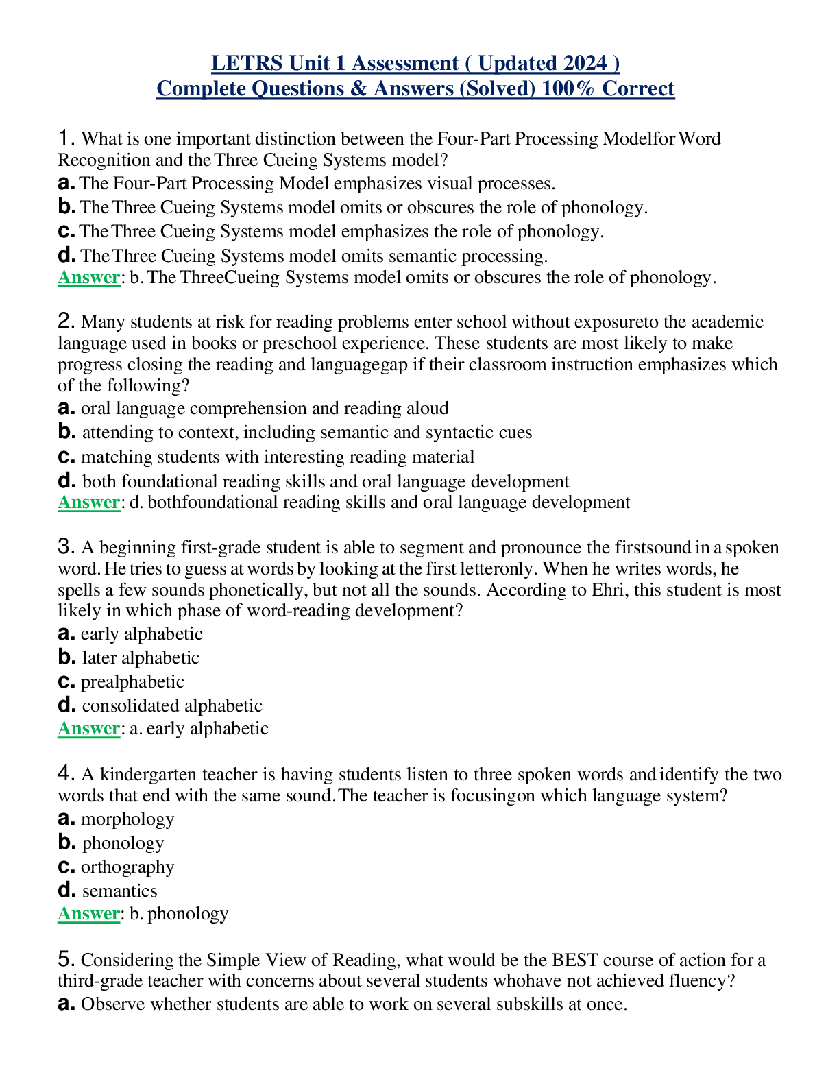 LETRS > EXAM > LETRS Unit 2 Assessment ( Updated 2024 ) Complete Questions & Answers (Solved) 100% Correct (All)