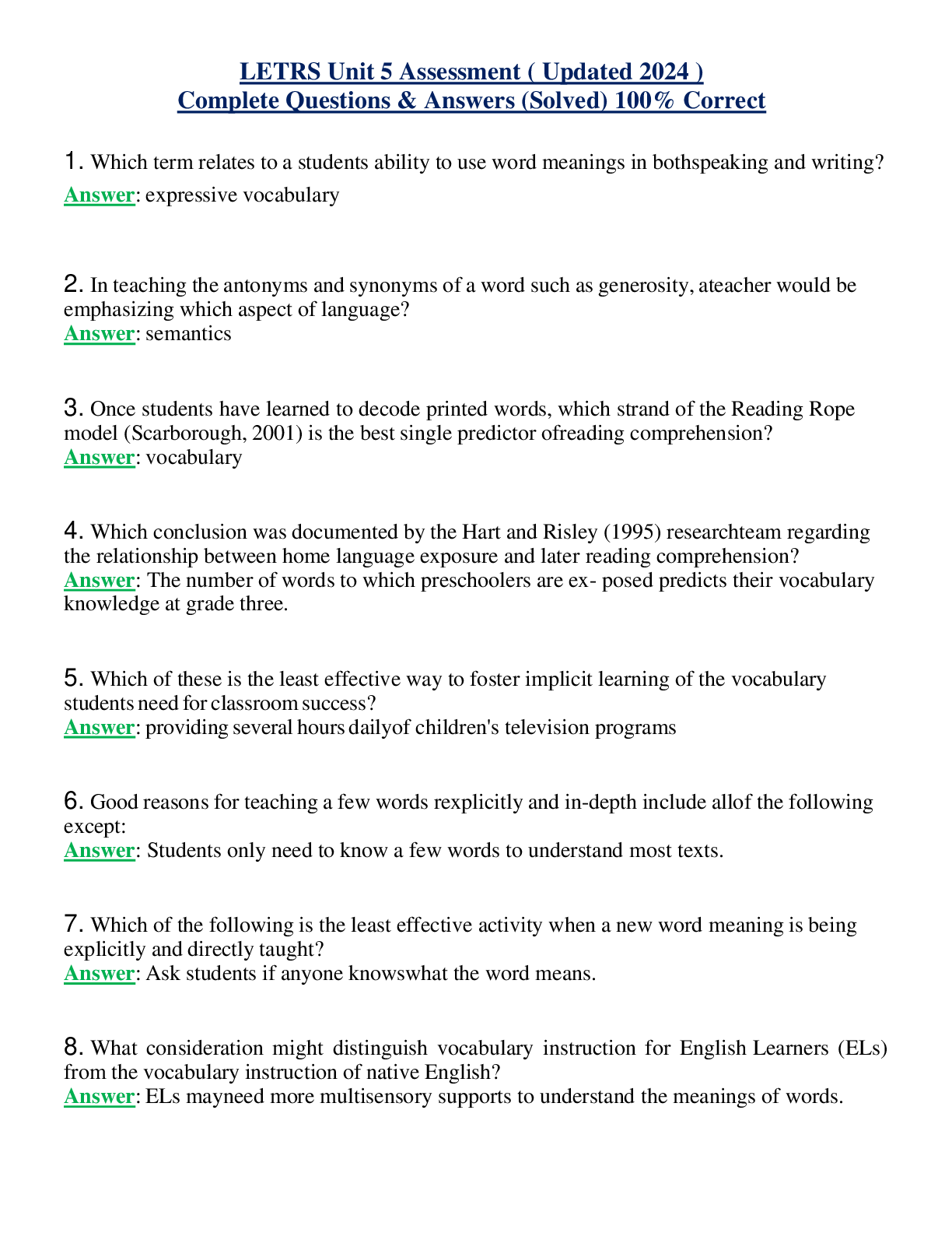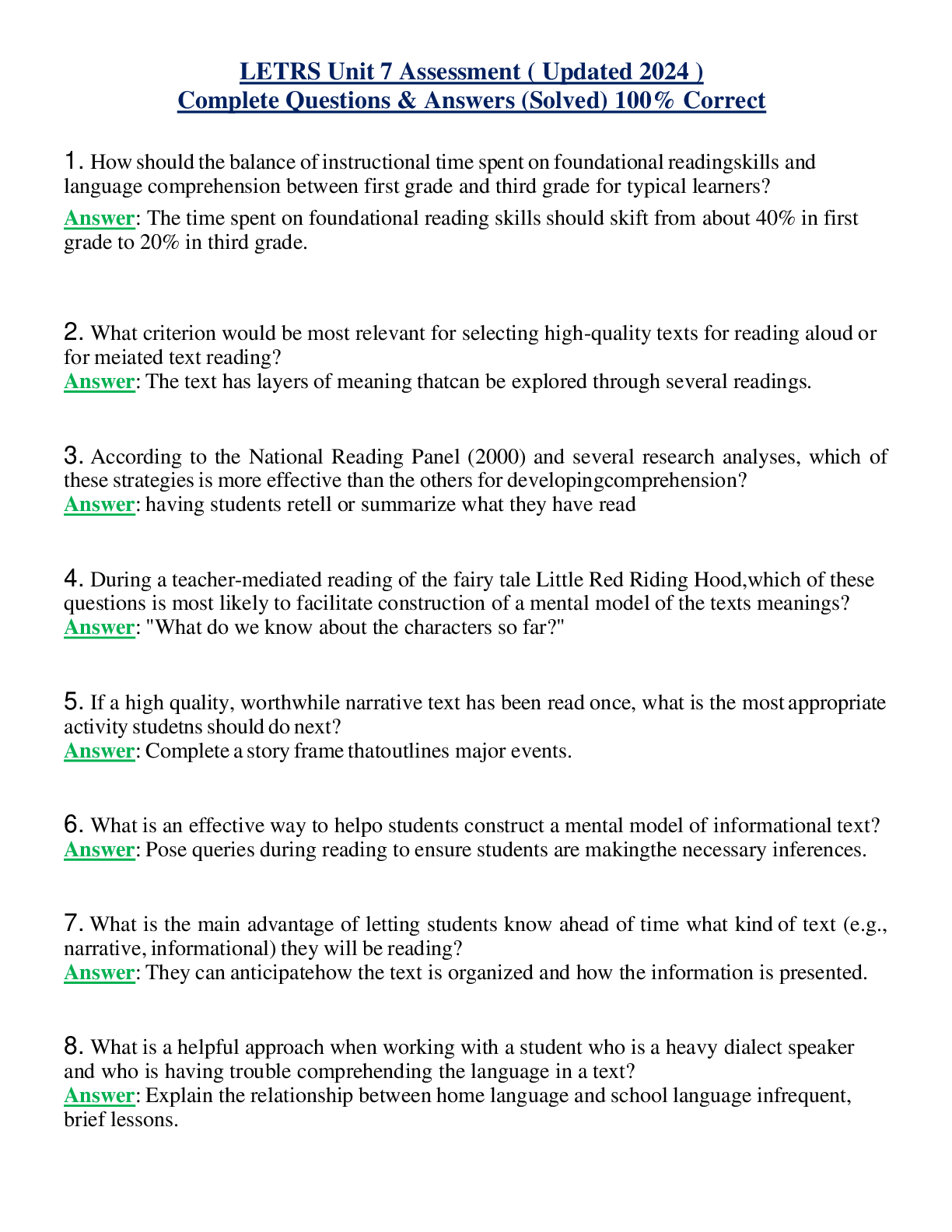 LETRS > EXAM > LETRS Unit 8 Assessment ( Updated 2024 ) Complete Questions & Answers (Solved) 100% Correct (All)