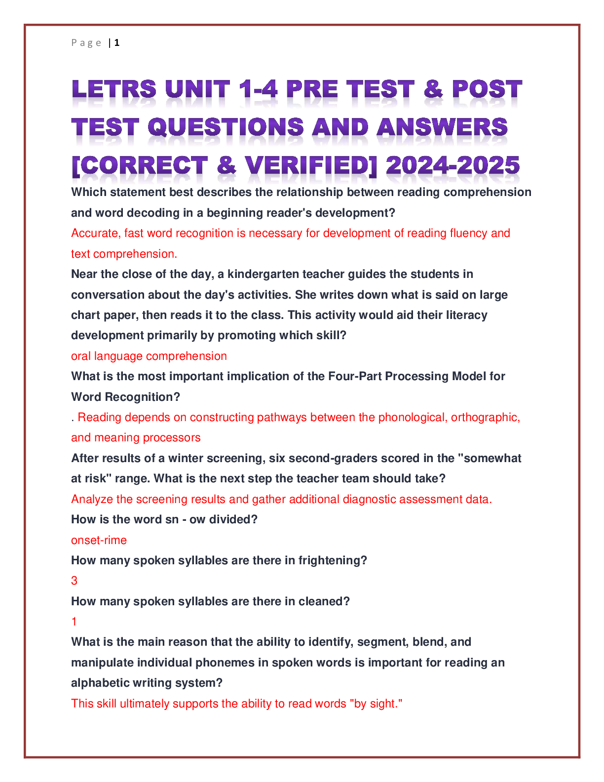 LETRS > EXAM > LETRS UNIT 1-4 PRE TEST & POST TEST QUESTIONS AND ANSWERS [CORRECT & VERIFIED] 2024-2025 (All)