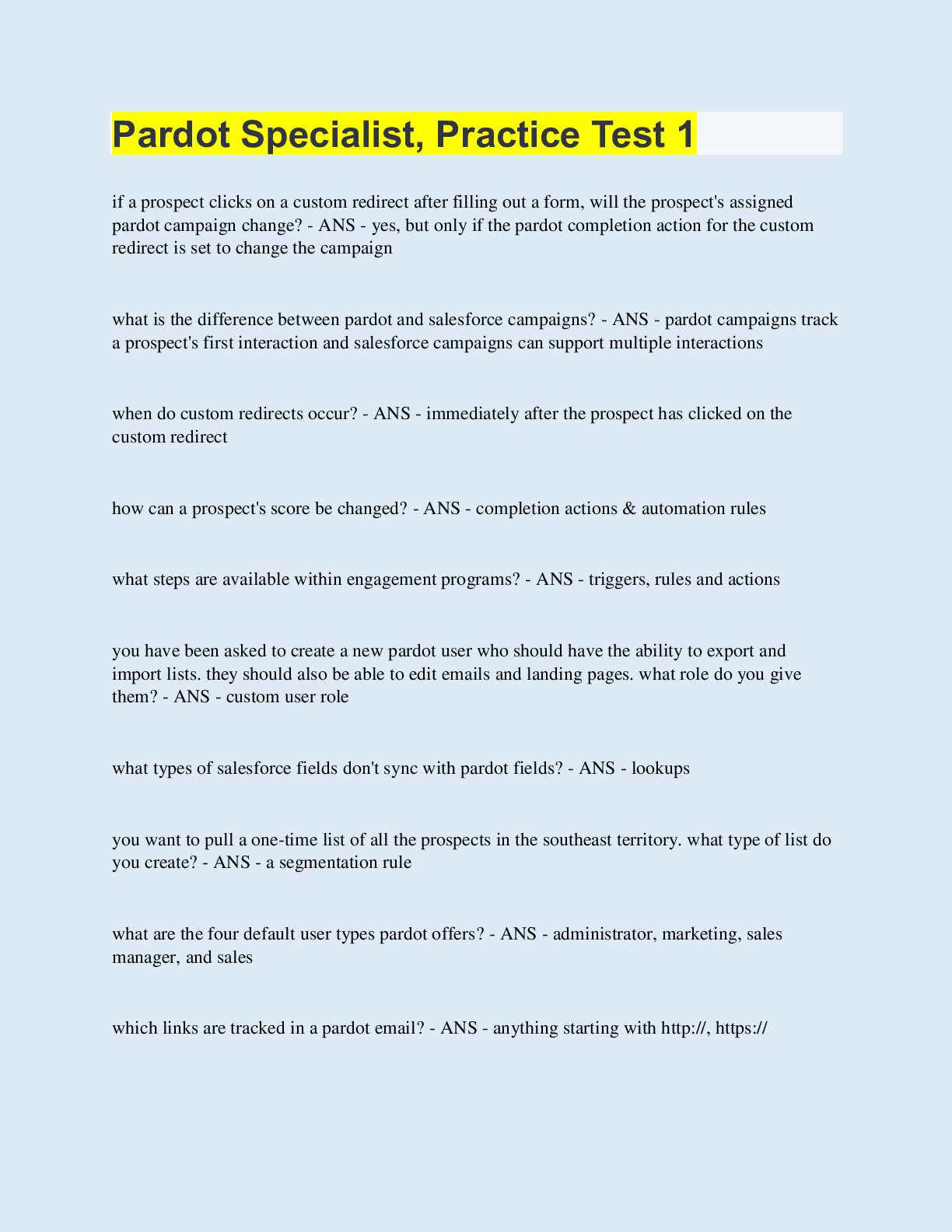 Marketing > QUESTIONS & ANSWERS > Pardot Specialist, Practice Test 1 (All)
