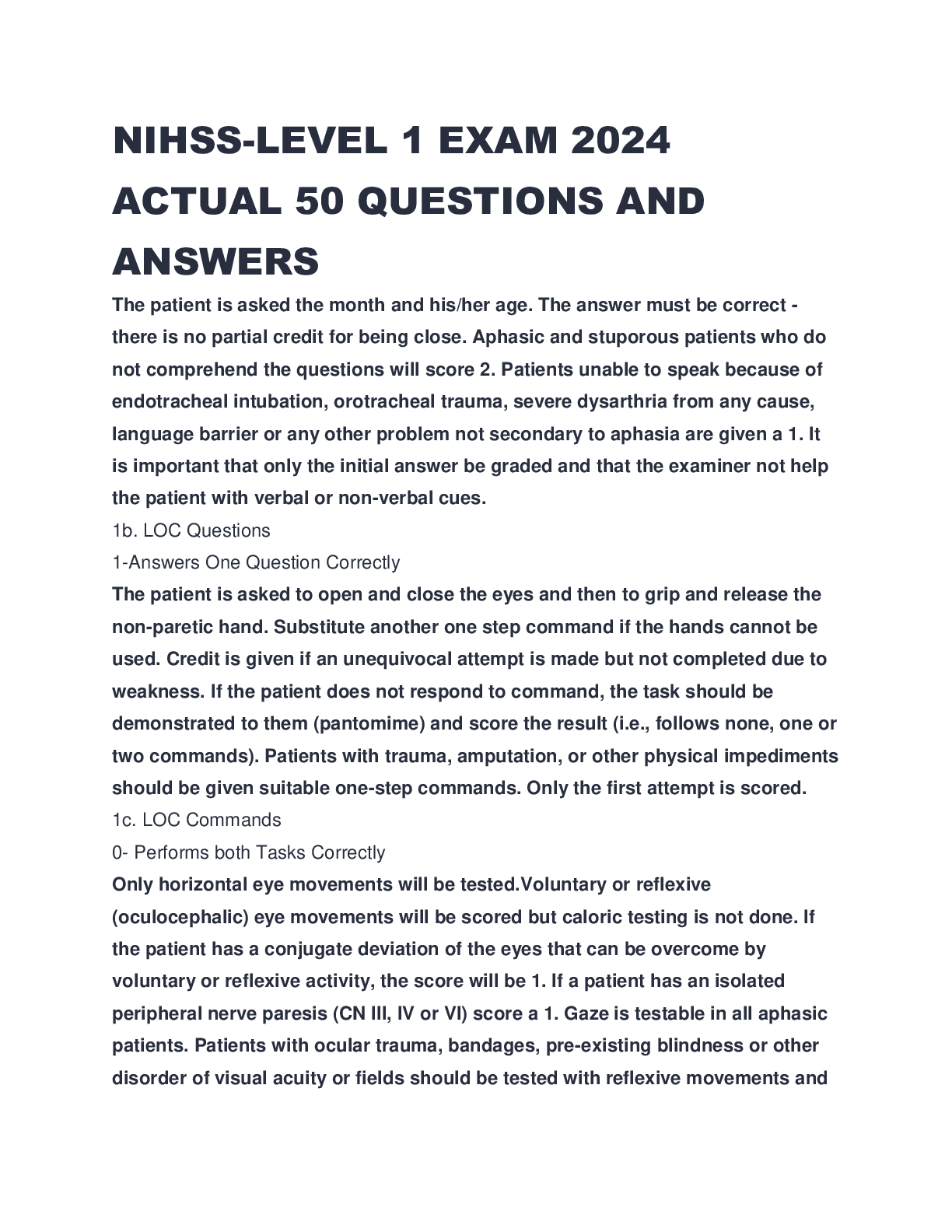 NIH Stroke Scale > EXAM > NIHSS-LEVEL 1 EXAM 2024 ACTUAL 50 QUESTIONS AND ANSWERS (All)