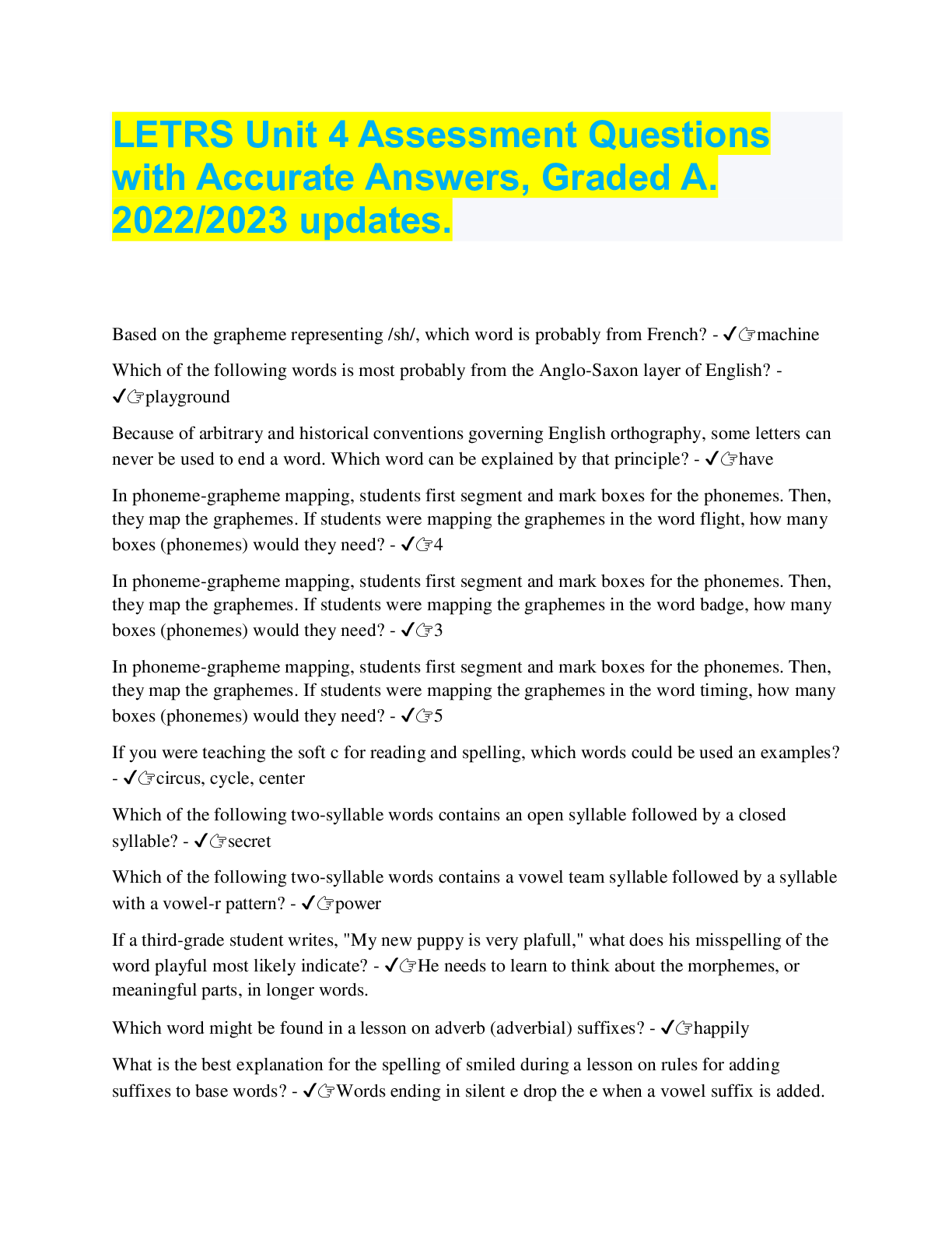 Language Development > QUESTIONS & ANSWERS > LETRS Unit 4 Assessment Questions with Accurate Answers, Graded A. 2022/2023 updates. (All)