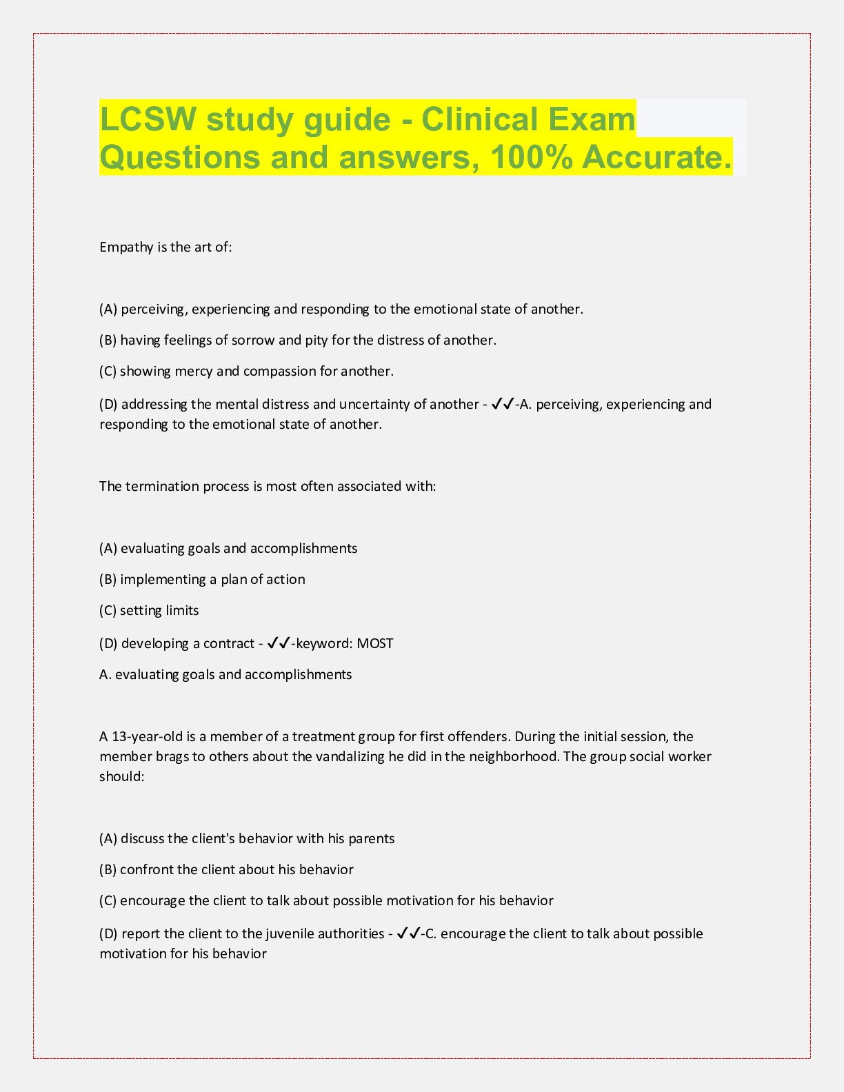 Social Sciences > QUESTIONS & ANSWERS > LCSW study guide - Clinical Exam Questions and answers, 100% Accurate. Empathy is the art of: (All)