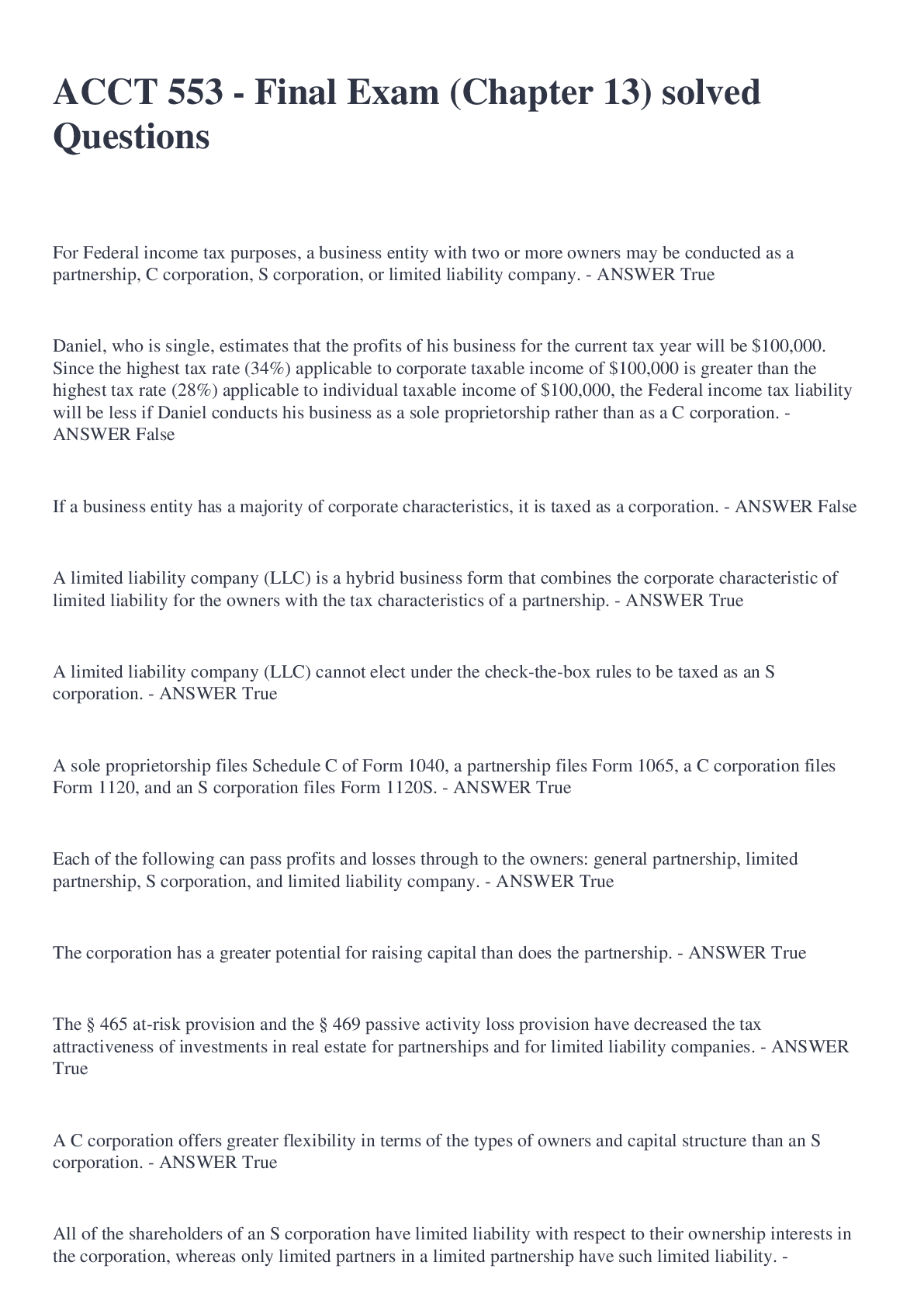 Social Sciences > EXAM > ACCT 553 - Final Exam (Chapter 13) solved Questions (All)