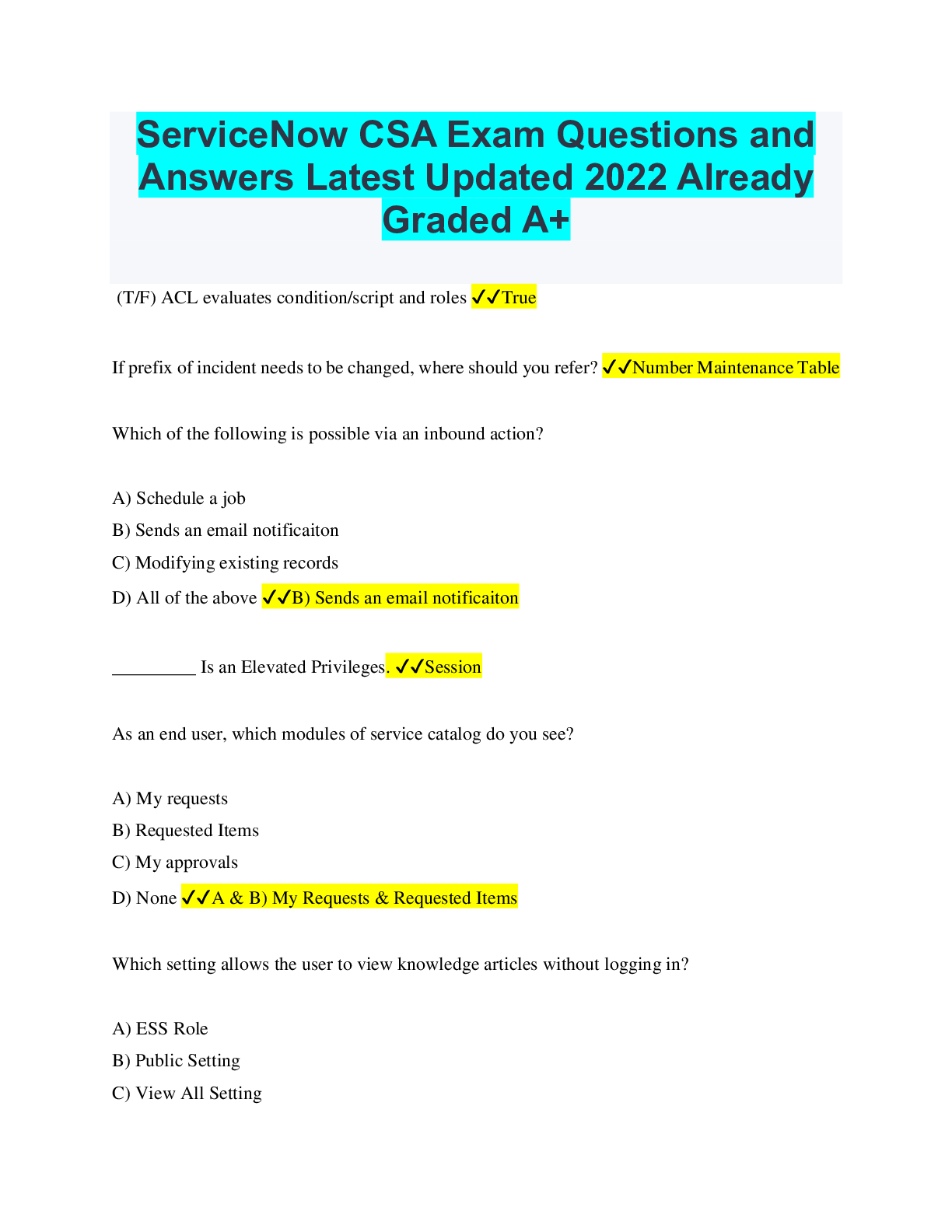 Social Sciences > EXAM > ServiceNow CSA Practice Exams Questions and Answers Latest Updated 2022 Graded A+ (All)