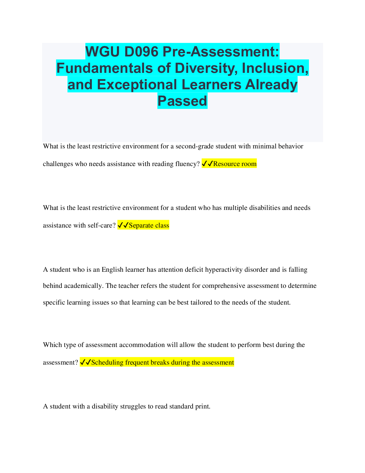 Social Sciences > QUESTIONS & ANSWERS > WGU D096 Pre-Assessment: Fundamentals of Diversity, Inclusion, and Exceptional Learners Already Passed (All)