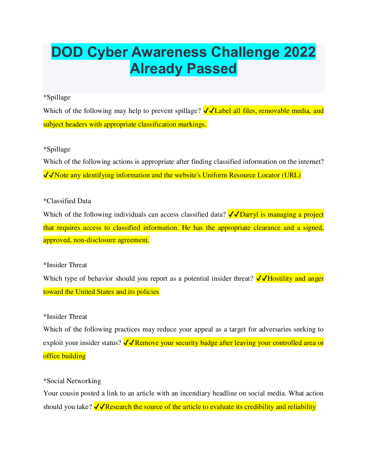 Social Sciences > QUESTIONS & ANSWERS > DOD Cyber Awareness Challenge 2022 Already Passed (All)