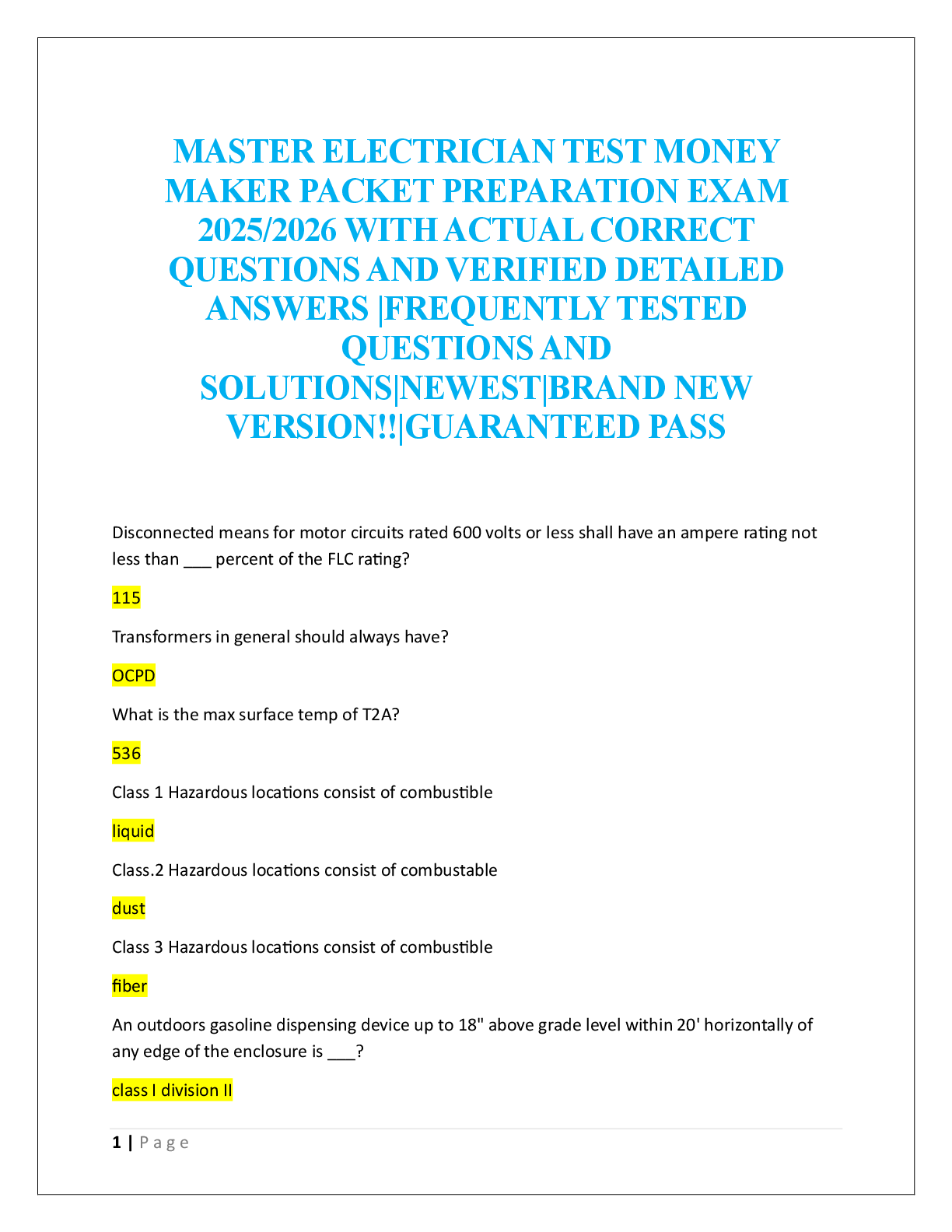 Electronics > EXAM > MASTER ELECTRICIAN TEST MONEY MAKER PACKET PREPARATION EXAM (All)