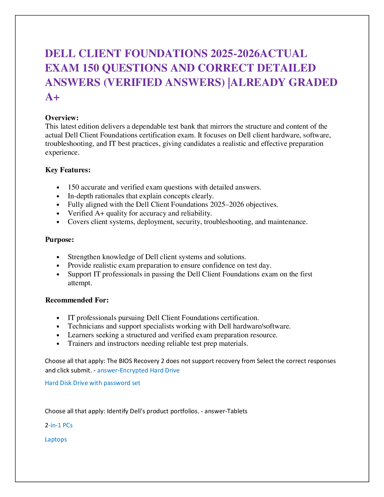 Electronics > EXAM > DELL CLIENT FOUNDATIONS 2025-2026ACTUAL EXAM 150 QUESTIONS AND CORRECT DETAILED ANSWERS (VERIFIED ANSWERS) |ALREADY GRADED A+ (All)