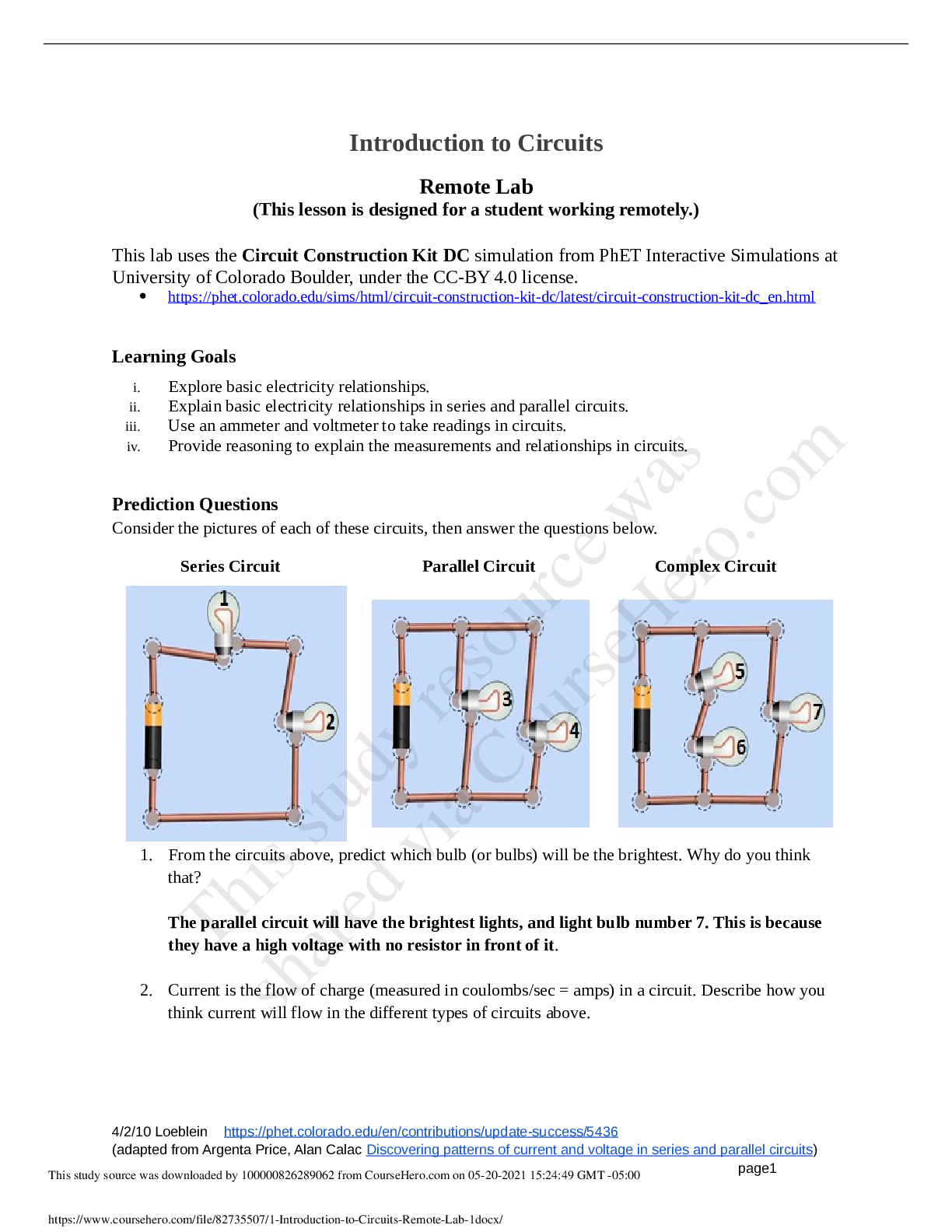 Electrical Engineering > Lab Experiment > Concordia University TexasBIOL 24121-Introduction to Circuits Remote Lab-ANSWERS PROVIDED-GRADED A (All)