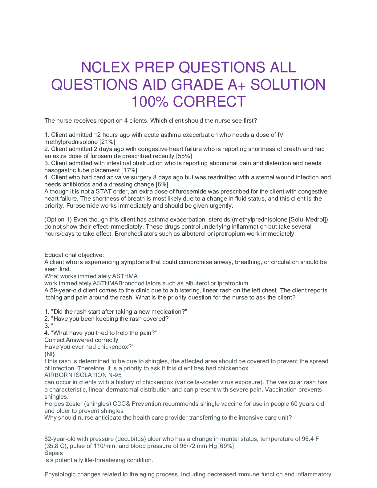 Mining > Summary > NCLEX PREP QUESTIONS ALL QUESTIONS AID GRADE A+ SOLUTION 100% CORRECT (All)
