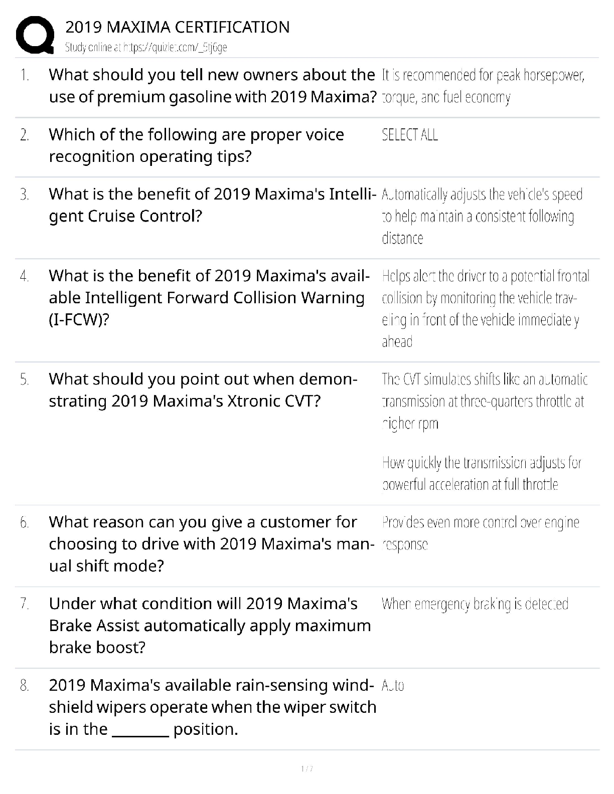 Mechanical Engineering > QUESTIONS & ANSWERS > 2019 Maxima Certification / Nissan Technician Exam / NATEF-Aligned Prep / Diagnostic & Repair (All)