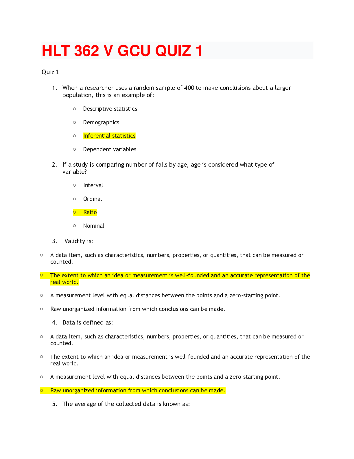 Horticulture > EXAM > HLT 362 V GCU QUIZ 1 Questions And Answers {Latest Version } (All)