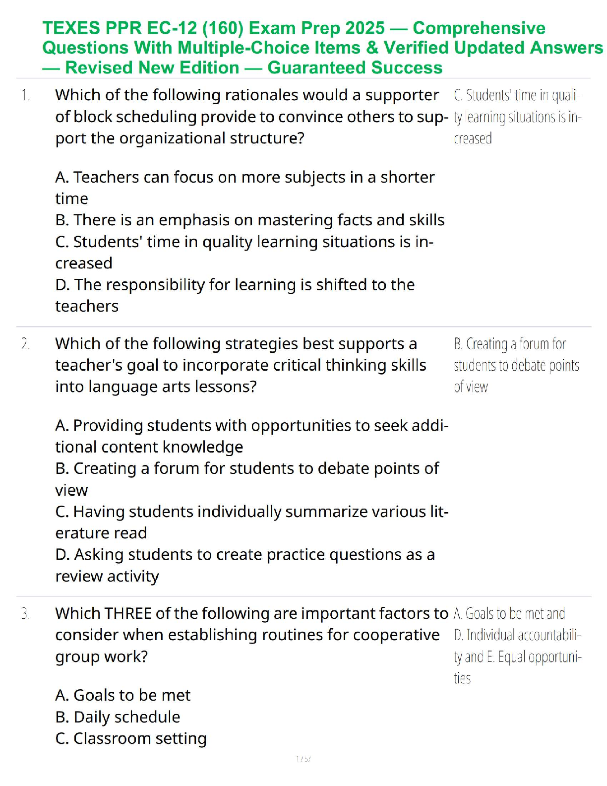 Professional Teaching Knowledge > STUDY GUIDE > TEXES PPR EC-12 (160) Exam Prep 2025 — Comprehensive Questions With Multiple-Choice Items & Verified Updated Answers — Revised New Edition — Guaranteed Success (All)