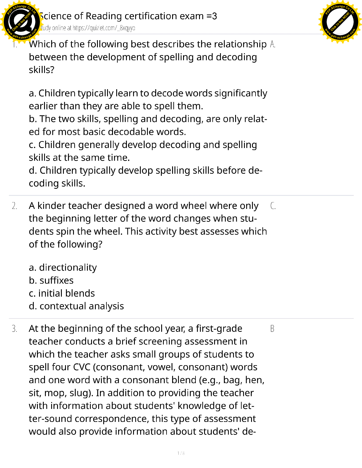 TSI (READING) > QUESTIONS & ANSWERS > Science of Reading Certification Exam / Practice Test & Study Guide / 2025 Update / Score 100% (All)