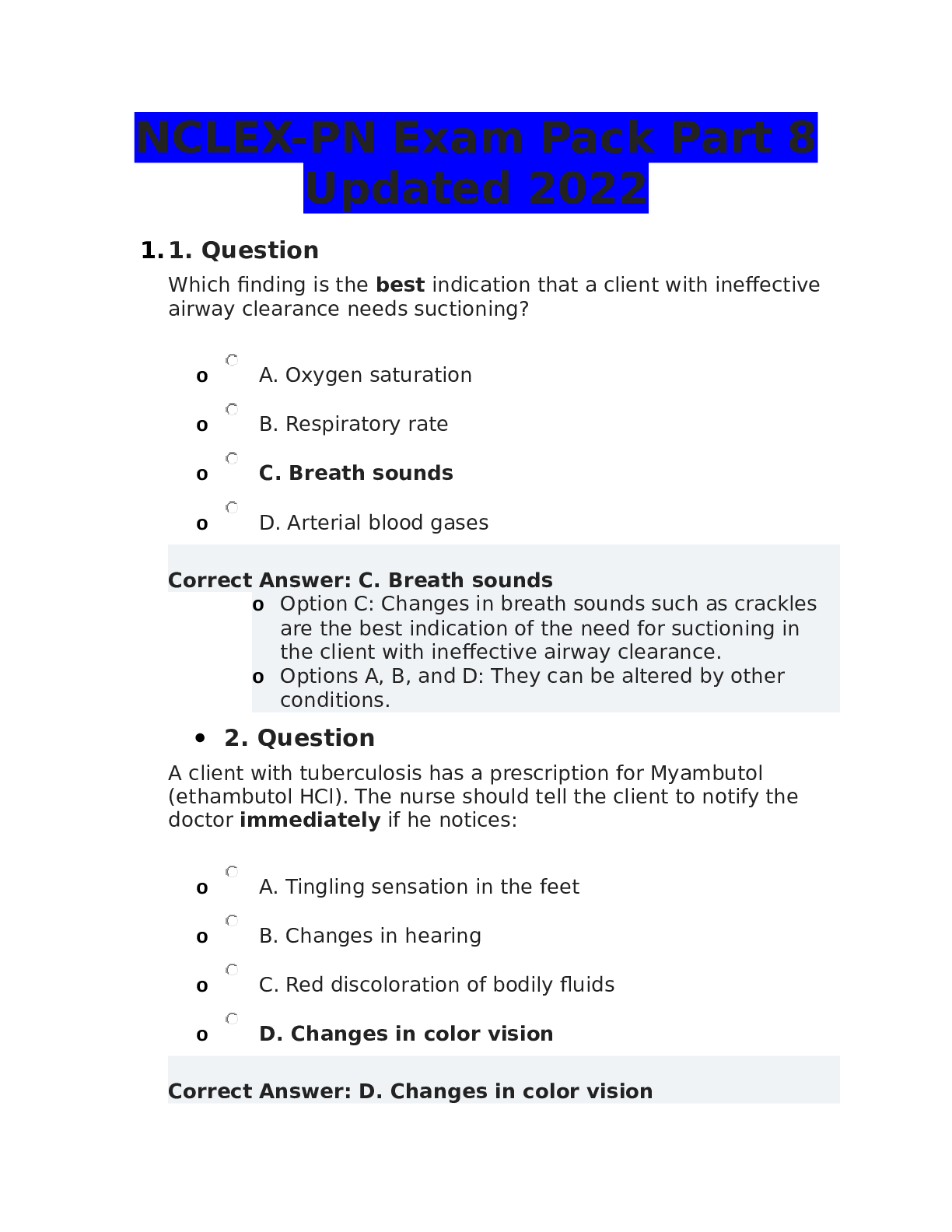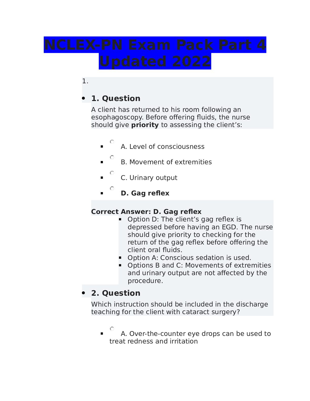 *NURSING > NCLEX-PN > NCLEX-PN Exam Pack Part 4 Updated 2022 correctly answered (All)