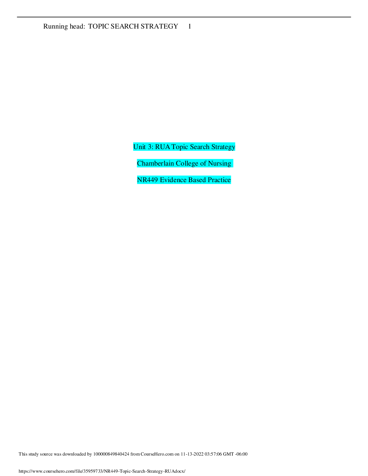 *NURSING > Research Paper > Chamberlain College of Nursing - NR 449NR449_Topic Search Strategy RUA. (All)