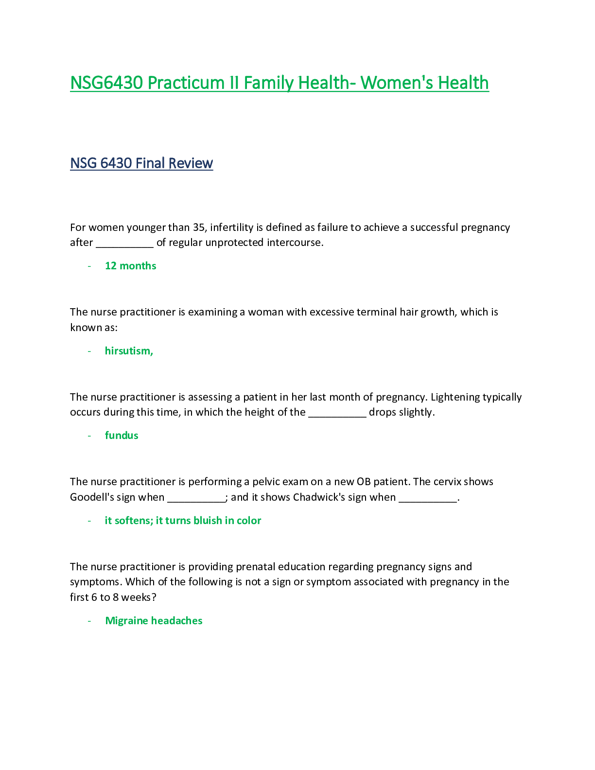 *NURSING > Final Exam Review > NSG6430 / NSG 6430 Final Review (Latest Update): Practicum II Family Health - Women's Health - South University (All)