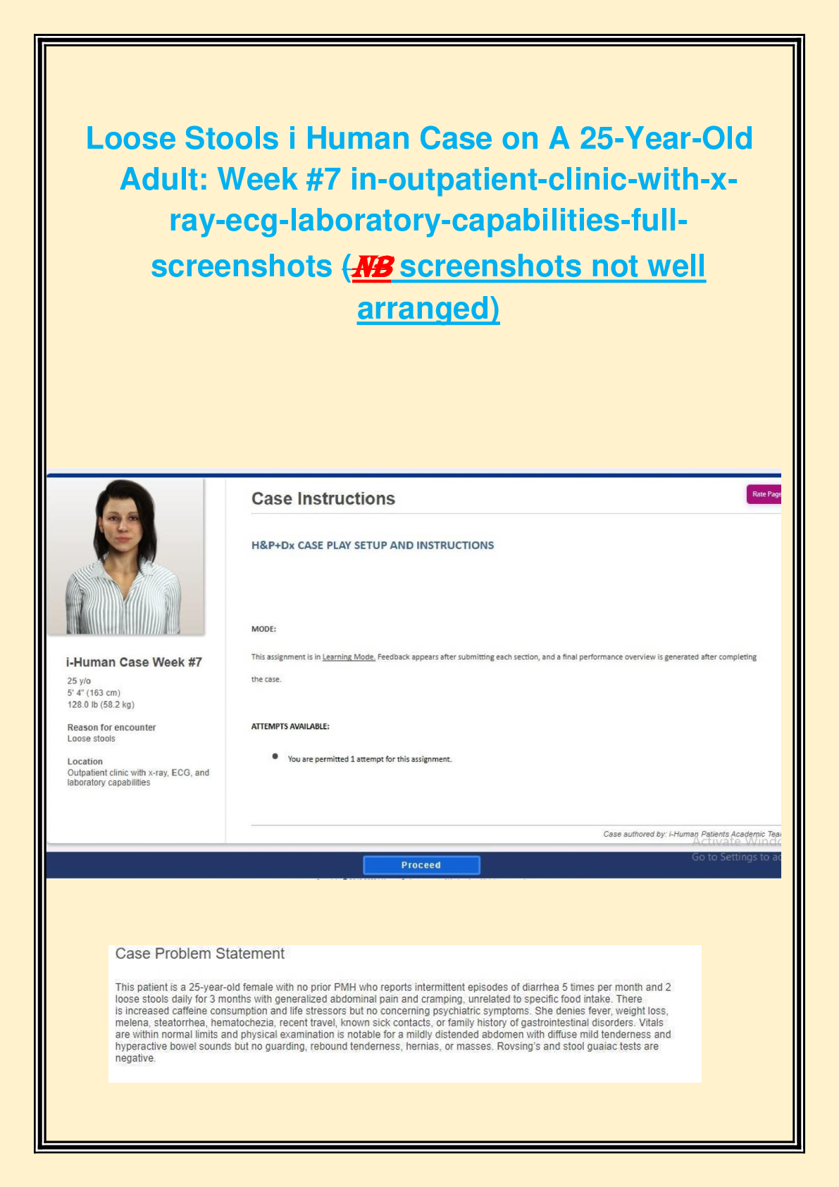 *NURSING > iHuman Case Studies > Loose Stools i Human Case on A 25-Year-Old Adult: Week #7 in-outpatient-clinic-with-x ray-ecg-laboratory-capabilities-full screenshots (NB screenshots not well arranged) (All)