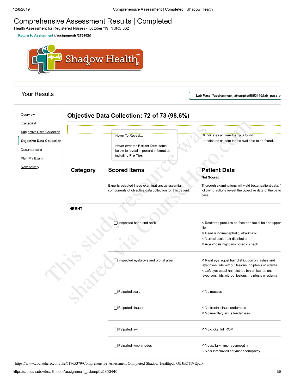 *NURSING > SHADOW HEALTH > NURS 362 Comprehensive Assessment Completed Shadow Health (All)